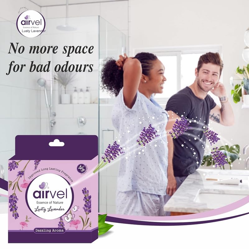 FIGHTS ODOR: Airvel bathroom freshener blocks effectively remove unpleasant odors, ensuring your bathroom always smells fresh and clean. By continuously releasing a pleasant Lavender fragrance, these air freshener blocks help prevent the recurrence of bad smells, creating a welcoming atmosphere.