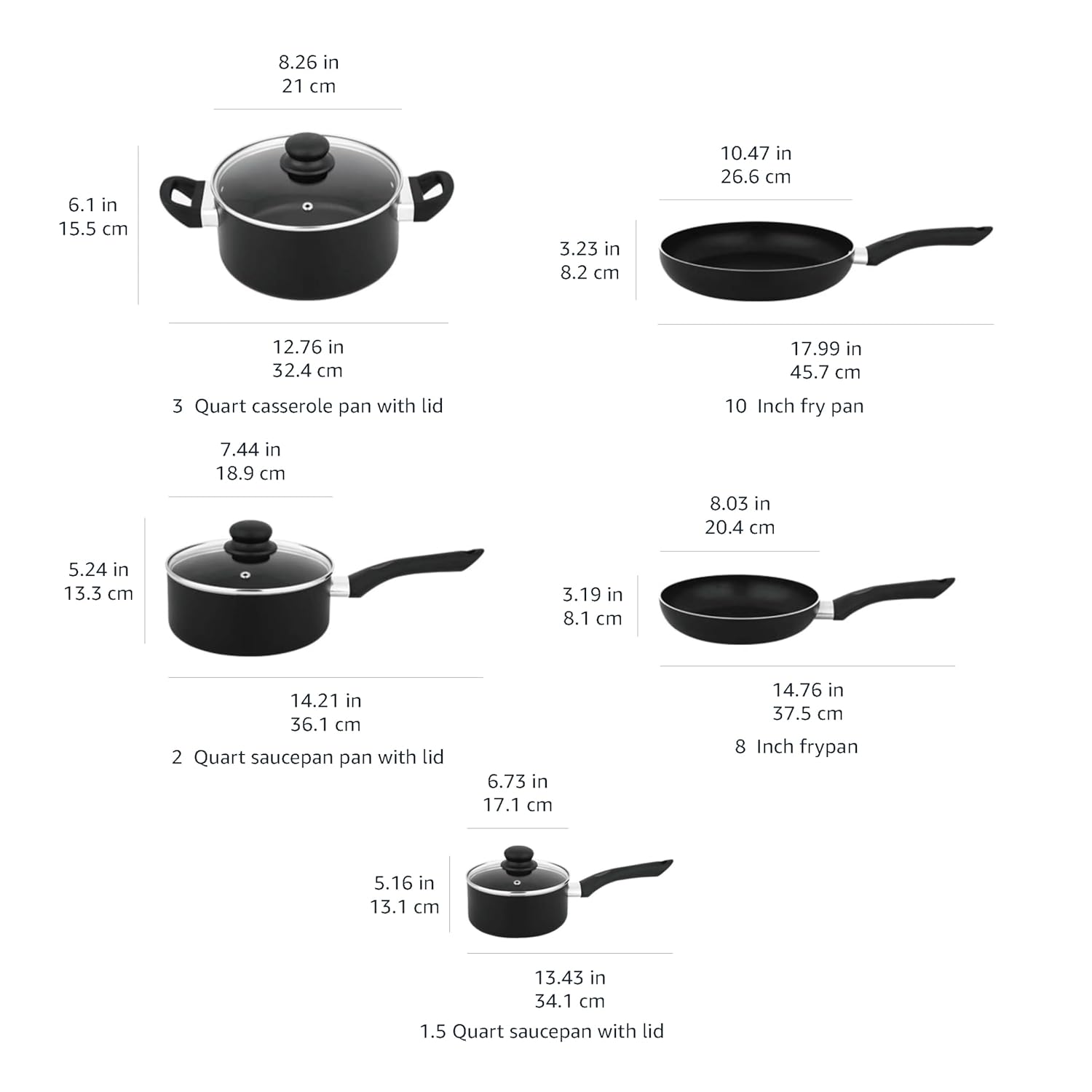 Package contents: Fry pan – 20 cm, fry pan – 26 cm, sauce pan – 16 cm with glass lid, sauce pan – 18 cm with glass lid, casserole – 20 cm with glass lid