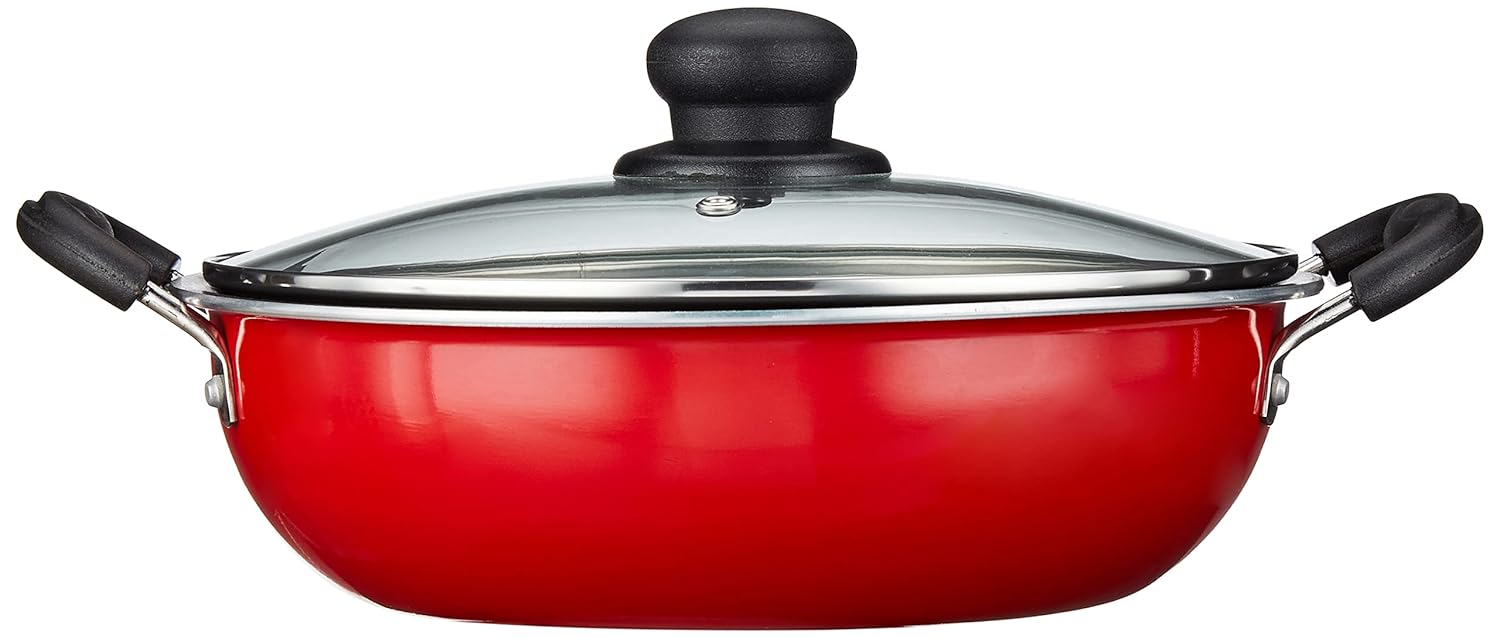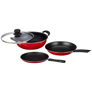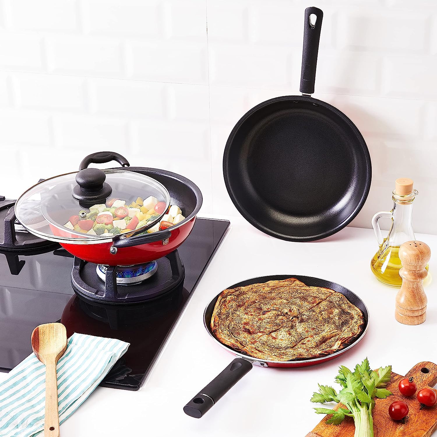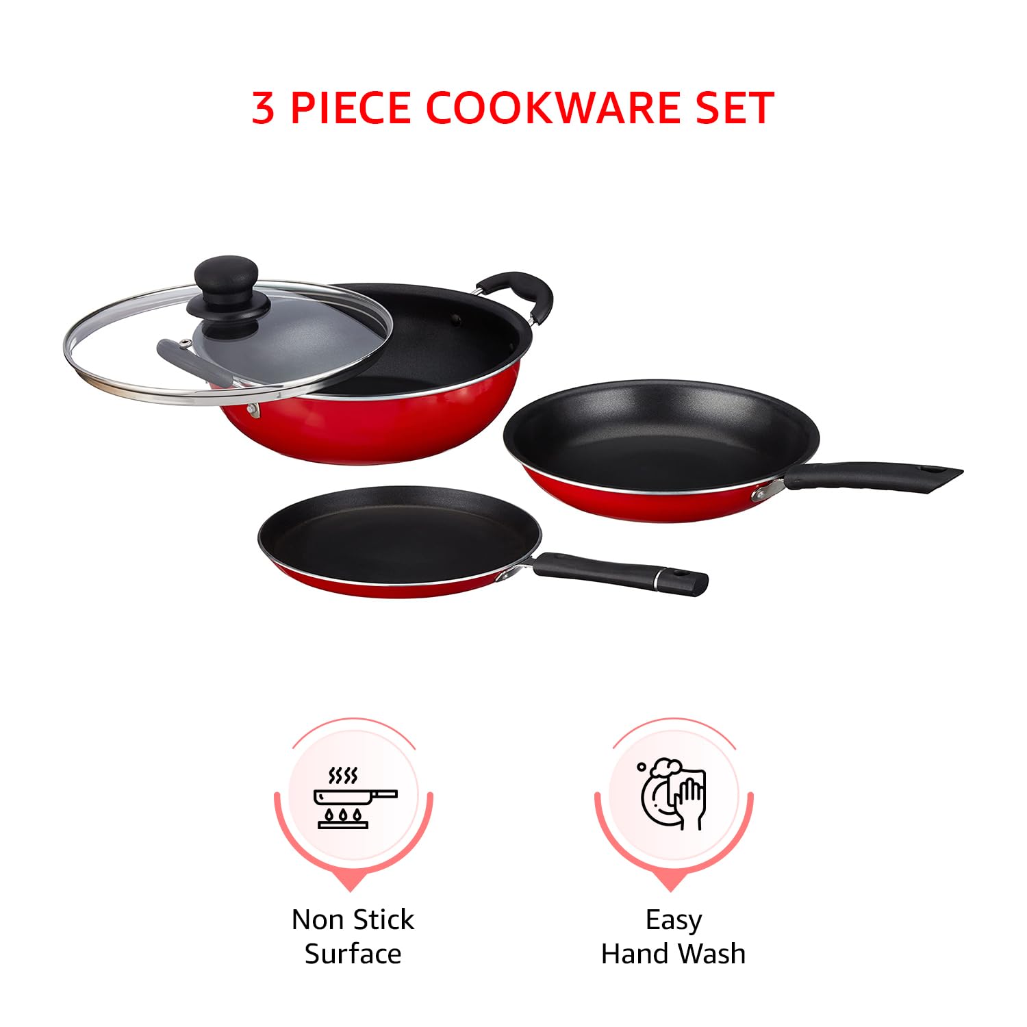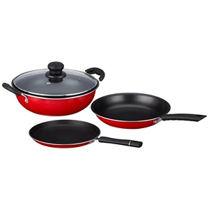 Package Contents: 3 pcs Non Stick cookware sets (Tawa 25 cm – 1N, Kadhai With Glass Lid 24 cm – 1N, Fry pan 24 cm – 1N)