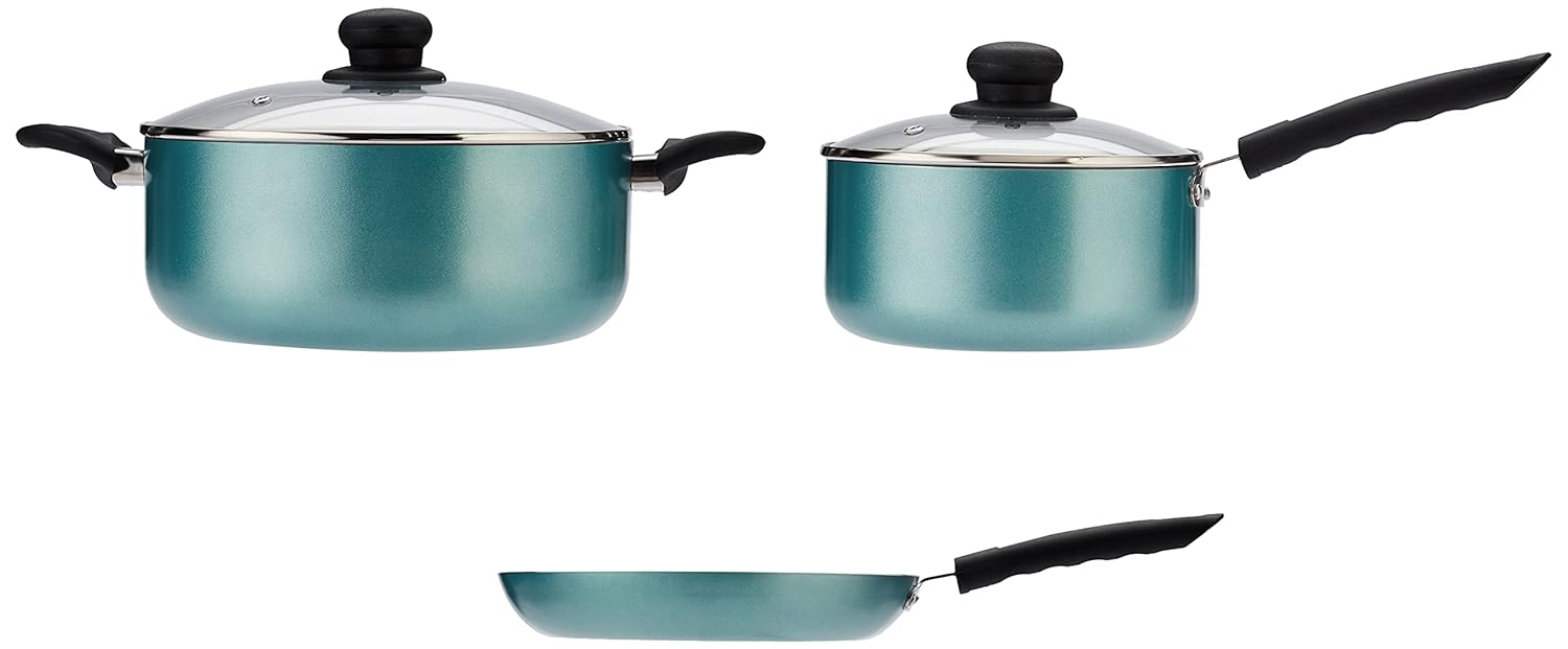 Easy to clean and dishwasher safe Caution: Avoid using metal utensils/ scrubbers on non-stick surface Package Contents:- Solimo Non-Stick Cookware Set; Includes Sauce Pan with Lid (18 cm, 2L), Dutch Oven with Lid (24 cm, 4L) & Fry Pan (24 cm, 1.25 L)
