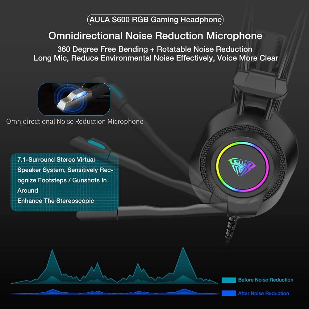 ???????Noise Cancelling Microphone?AULA gaming headphones with a 360 degree rotating noise canceling microphone that is ergonomically designed. can pick up sounds with great sensitivity and remove the noise, which enables you clearly deliver or receive messages while you are in a game. Long flexible mic design very convenient to adjust angle of the microphone. easily to switch on/off, adjustable microphone volume.