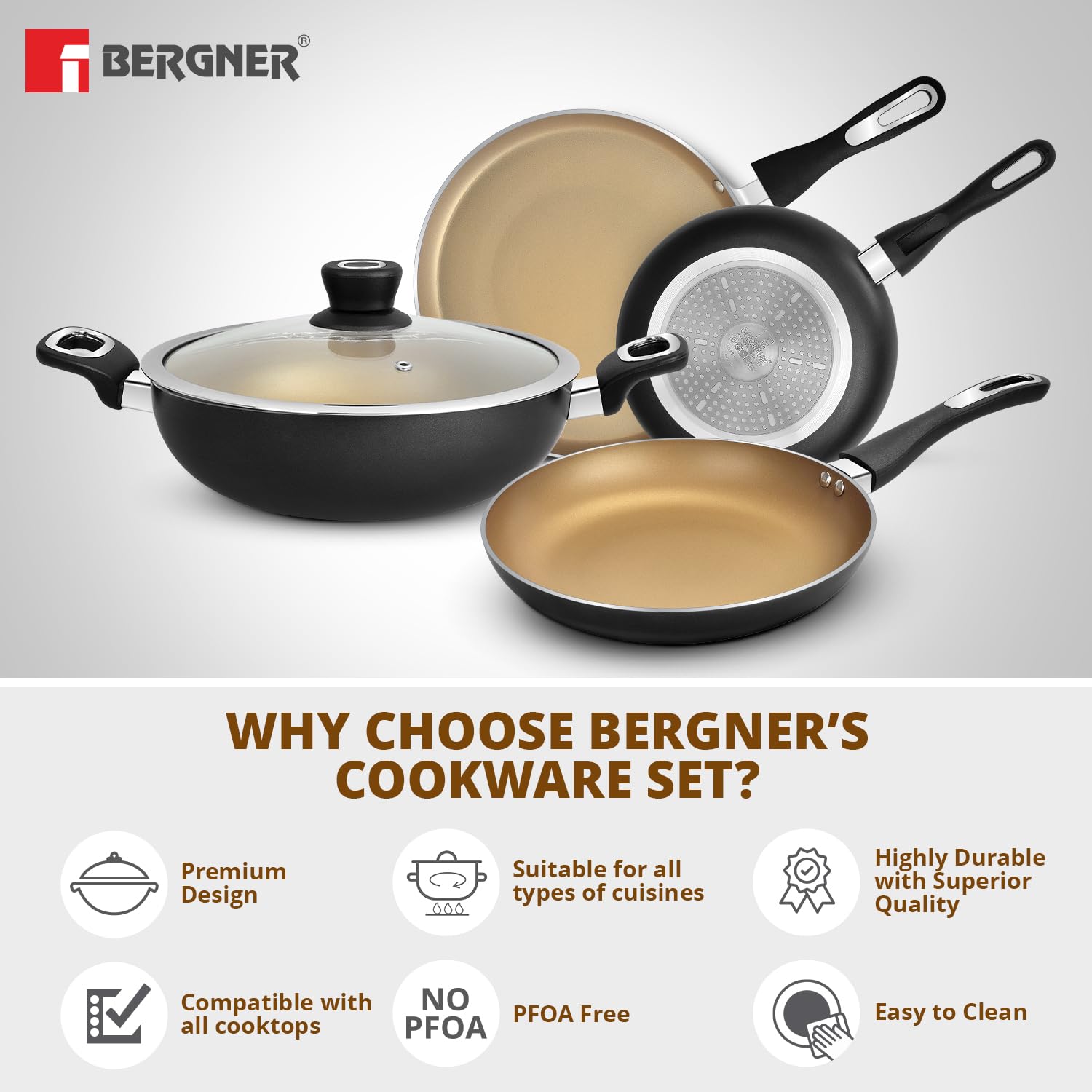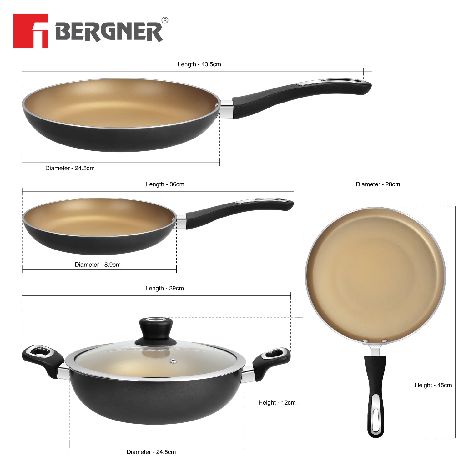 Elevate your culinary experience with the Bergner Optimum Non-Stick 5-Piece Cookware Set. This comprehensive set includes a 24cm kadai with a glass lid, a 24cm frypan, and a 28cm tawa, catering to a variety of cooking needs. The advanced ceramic coating ensures effortless cooking with minimal oil, preserving essential nutrients in your food. The heavy-gauge construction guarantees even heat distribution, preventing burning and ensuring your food is cooked to perfection. The set’s sleek green design complements any kitchen aesthetic. The tempered glass lid allows you to monitor your cooking process without lifting the lid, while the ergonomic bakelite handles provide a comfortable and heat-resistant grip. Compatible with all cooktops, including induction, this set is a versatile addition to any kitchen.