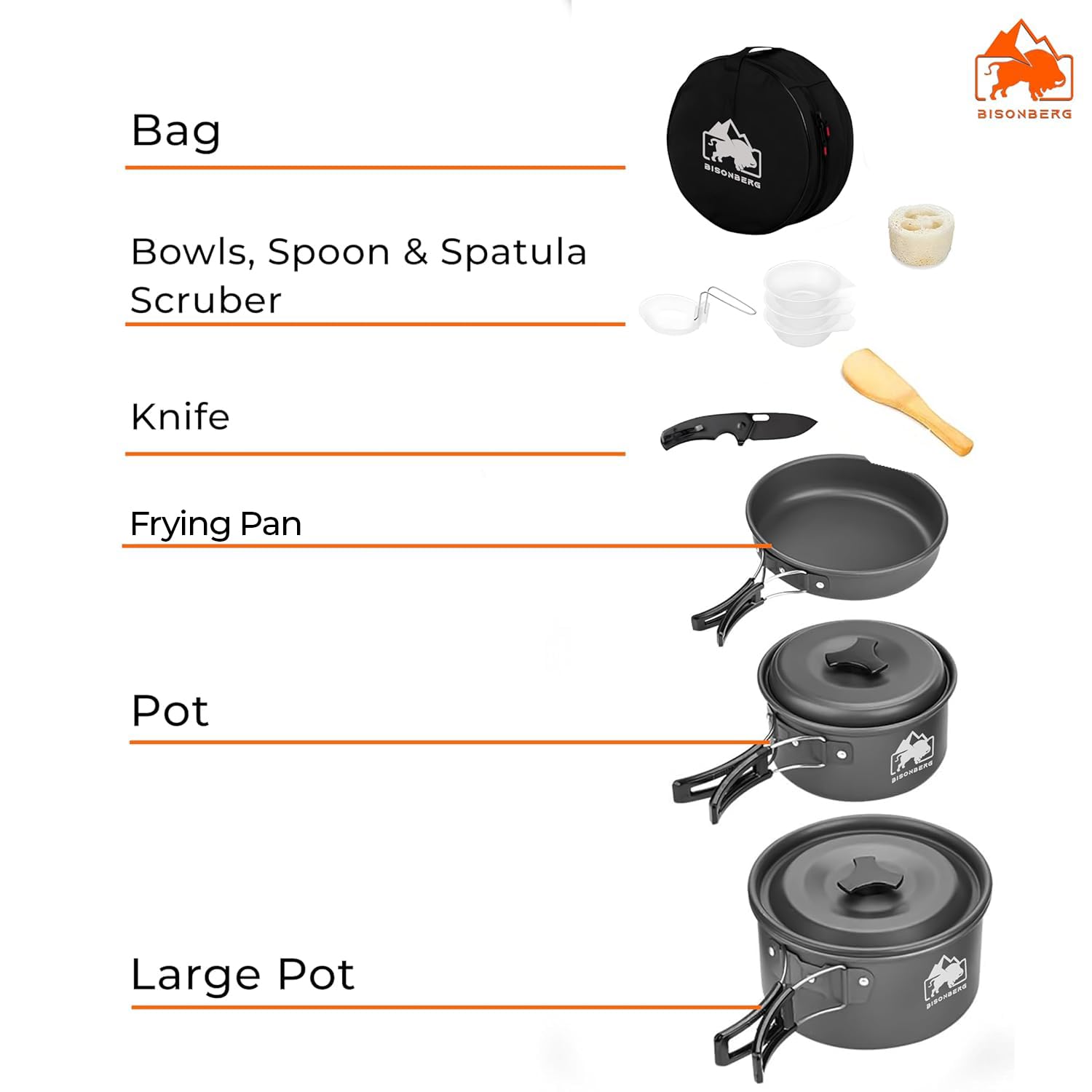 BISONBERG 11 Pcs Camping Cookware Set, Mess Kit, Camping Accessories for Outdoor, Camping Utensils with Carry Bag, Camping Bowl Pot Pan Set – Nonstick Aluminum – for 3 People Without Kettle