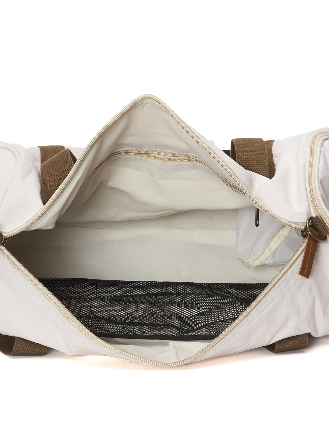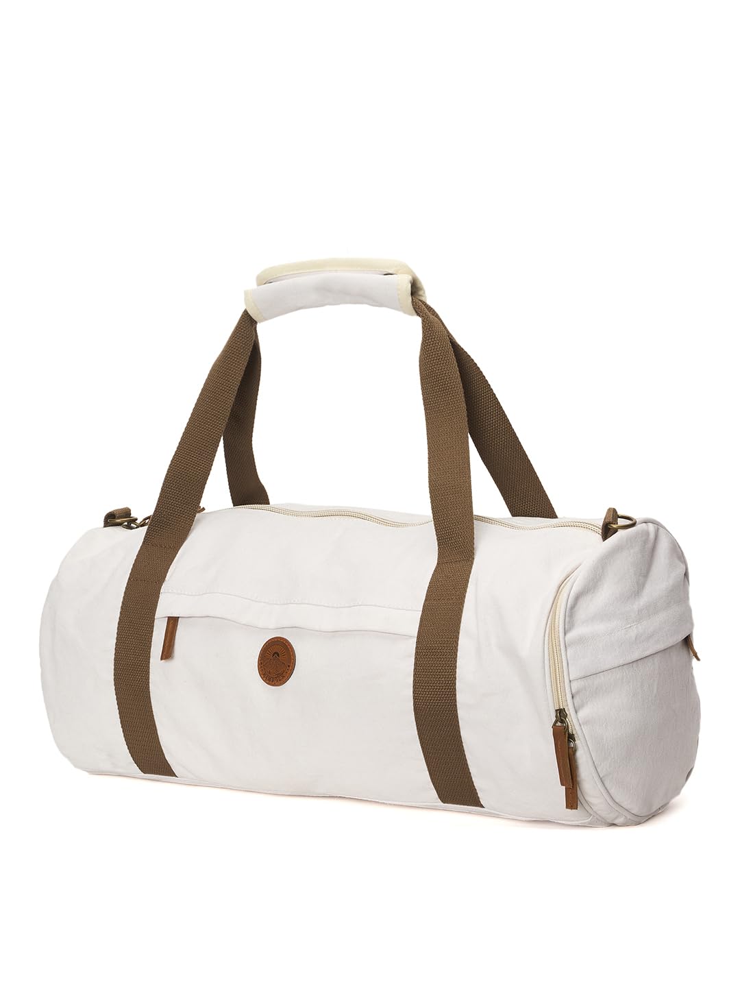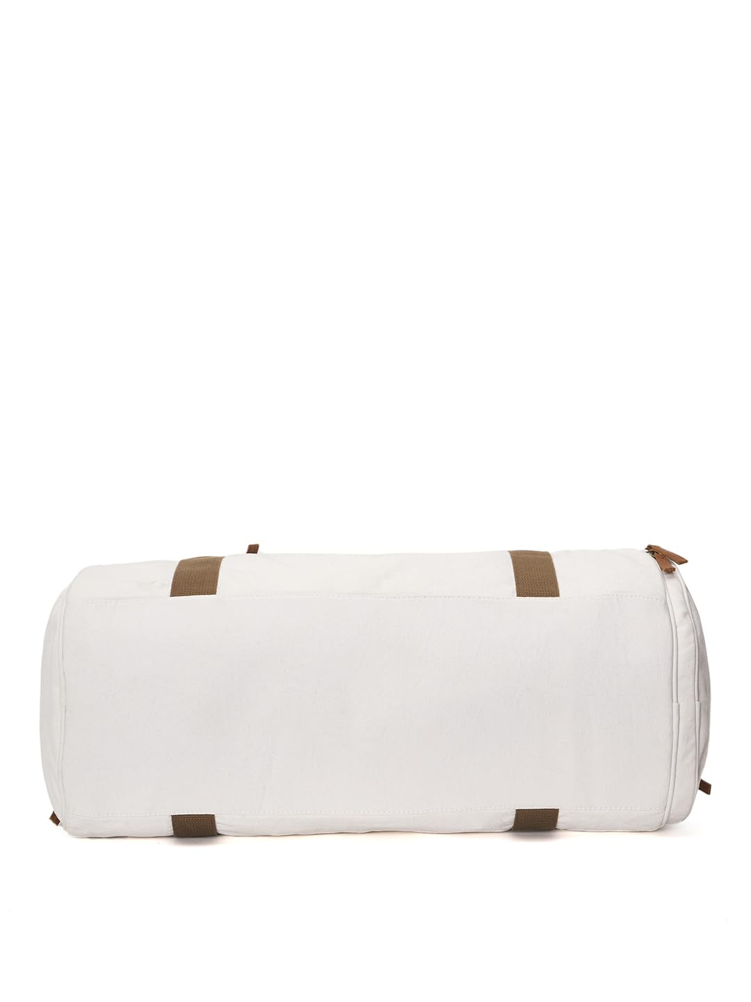 DESIGN FEATURES: Stylish duffle bag with white canvas construction, brown contrast straps, and vintage-style metal emblem on front pocket