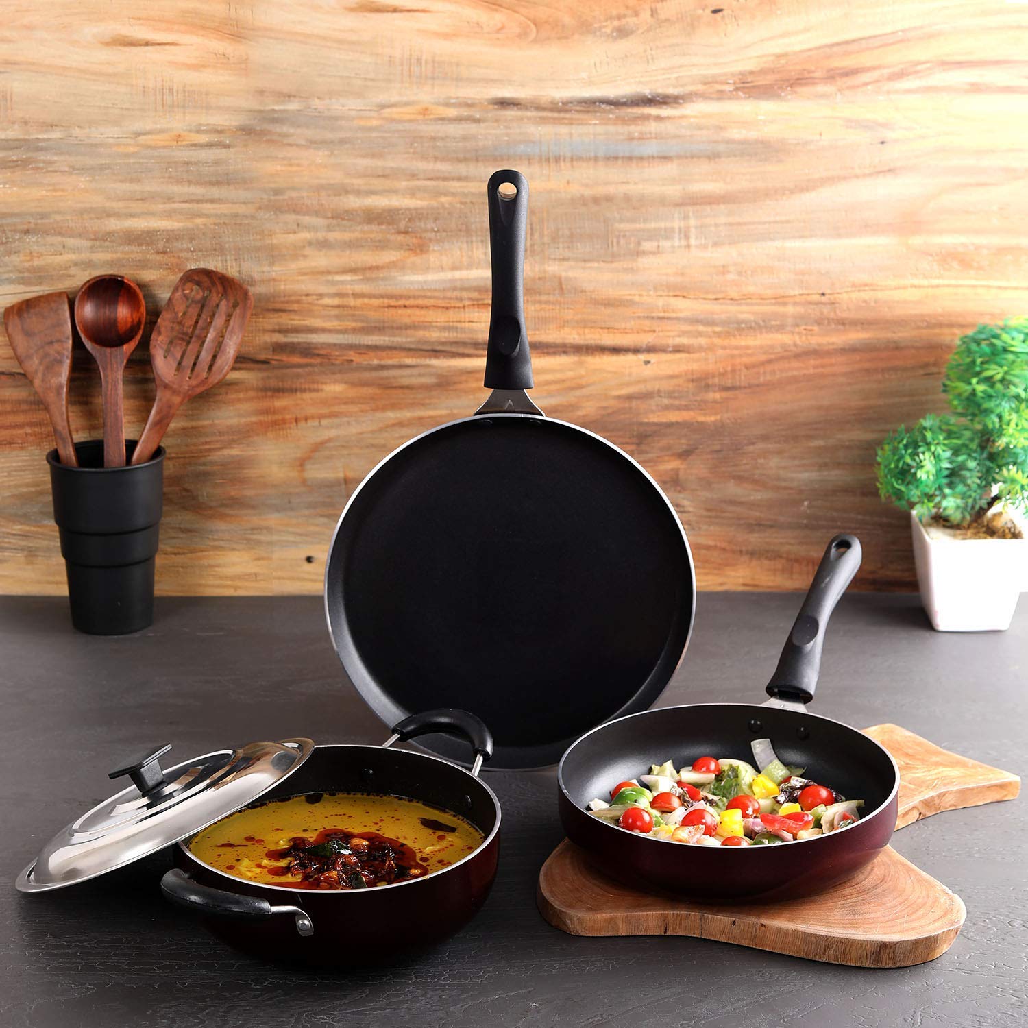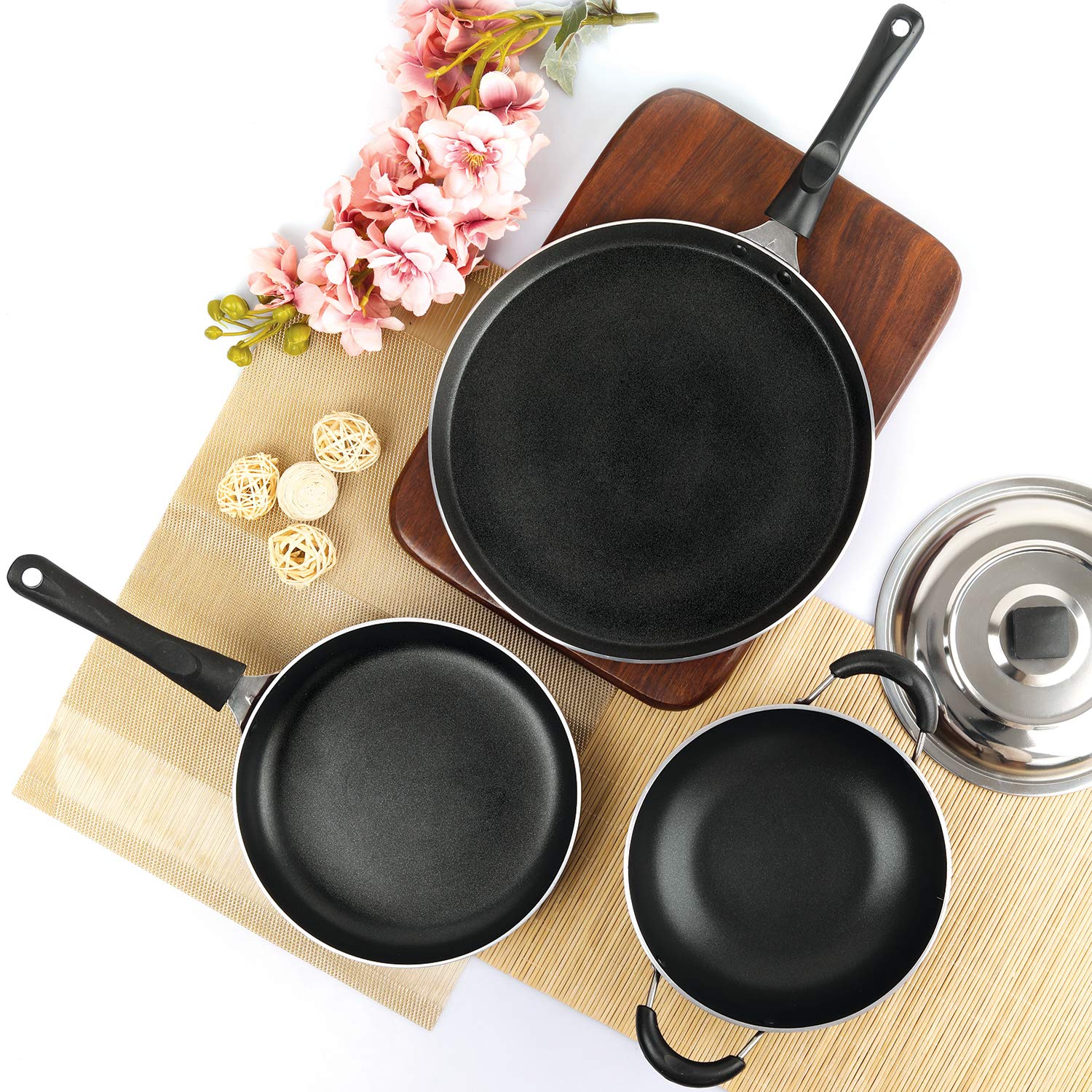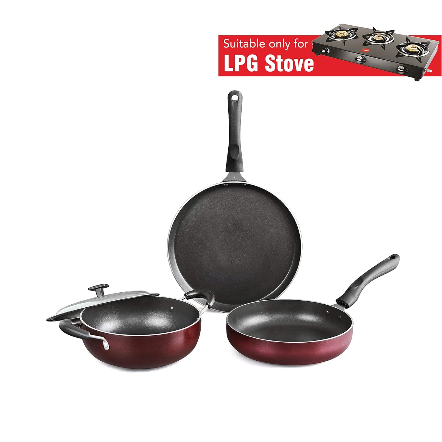 Material: Aluminium, Lid: Stainless Steel; Size: Kadhai Capacity – 2 Litres, Dosa Tawa: 422mmx255mmx18mm, Fry Pan – 380mmx215mmx50mm; Base type: Non Induction Base; Base thickness: 2.5mm; Colour: Cherry