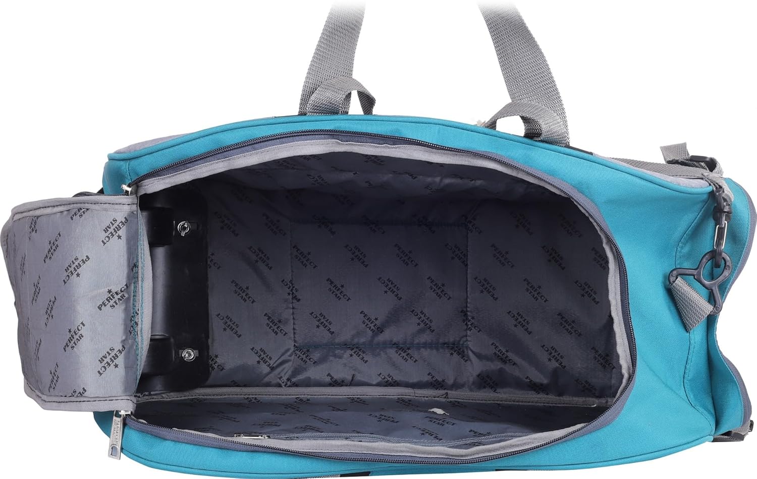 This travel bag, a medium and sophisticated travel duffle trolley bag is handcrafted from high-quality water-resistant polyester. The bag offers a high storage capacity and 2 wheel trolley system makes the travel easier. Padded handles give comfort and mobility to the bag user. Multi-pocket spacious bag to fit in all essentials accompanied by adjustable and detachable shoulder strap for more comfort.Spacious Big Compatrmnet, both side pockets for easy access, front big pocket, inside big pocket, Adjustable Shoulder Strap