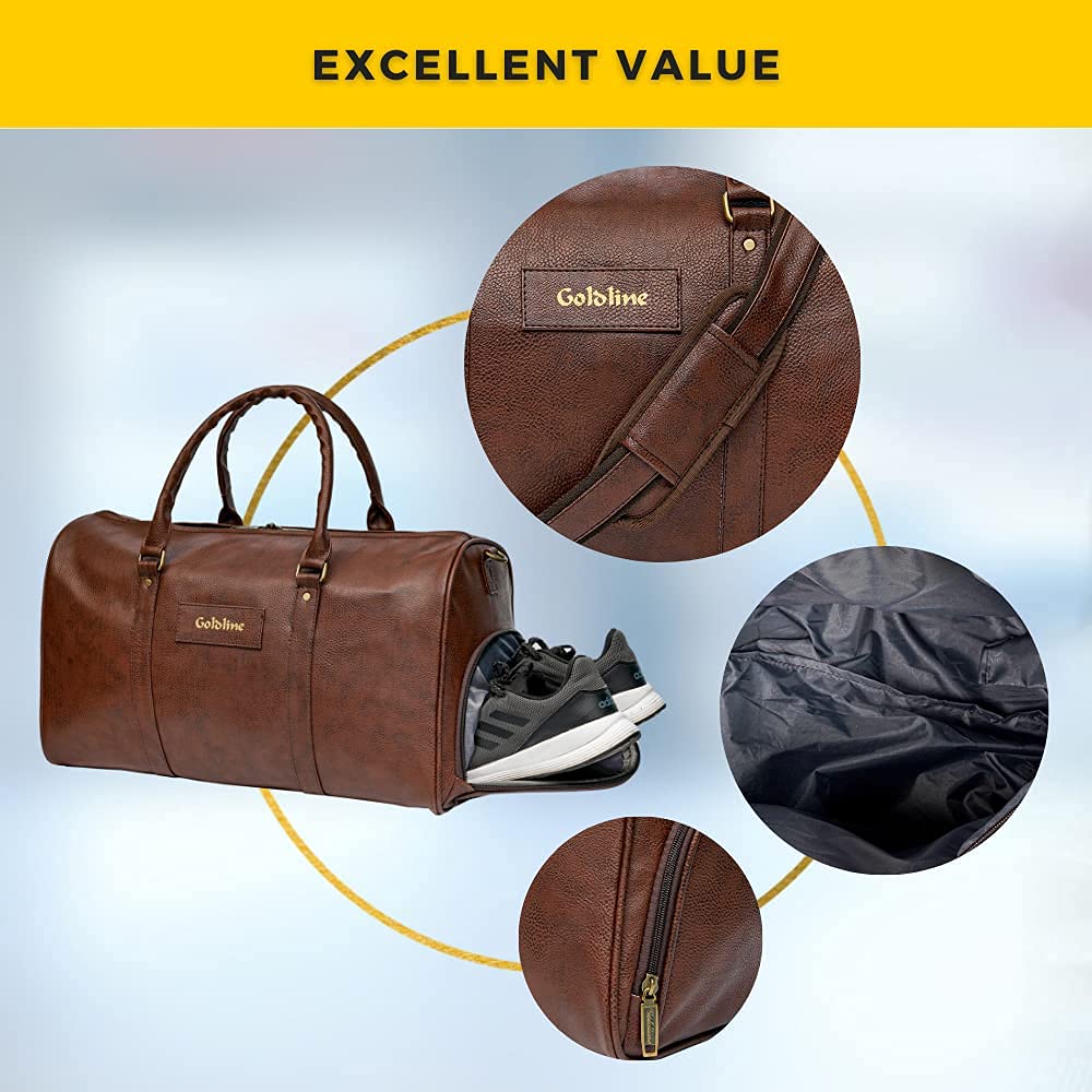 PREMIUM MATERIAL – This Travel Duffle Bag is made of high-quality premium leather, which is shiny and smooth. The textured surface is fashionable and stylish which makes it suitable as Leather Gym Bag; DIMENSIONS – Length (L) : 20 inches Width (W): 12 inches and Height (H): 12 inches; Weight: 900 gms , Capacity: 50 Litres, Colour: Brown