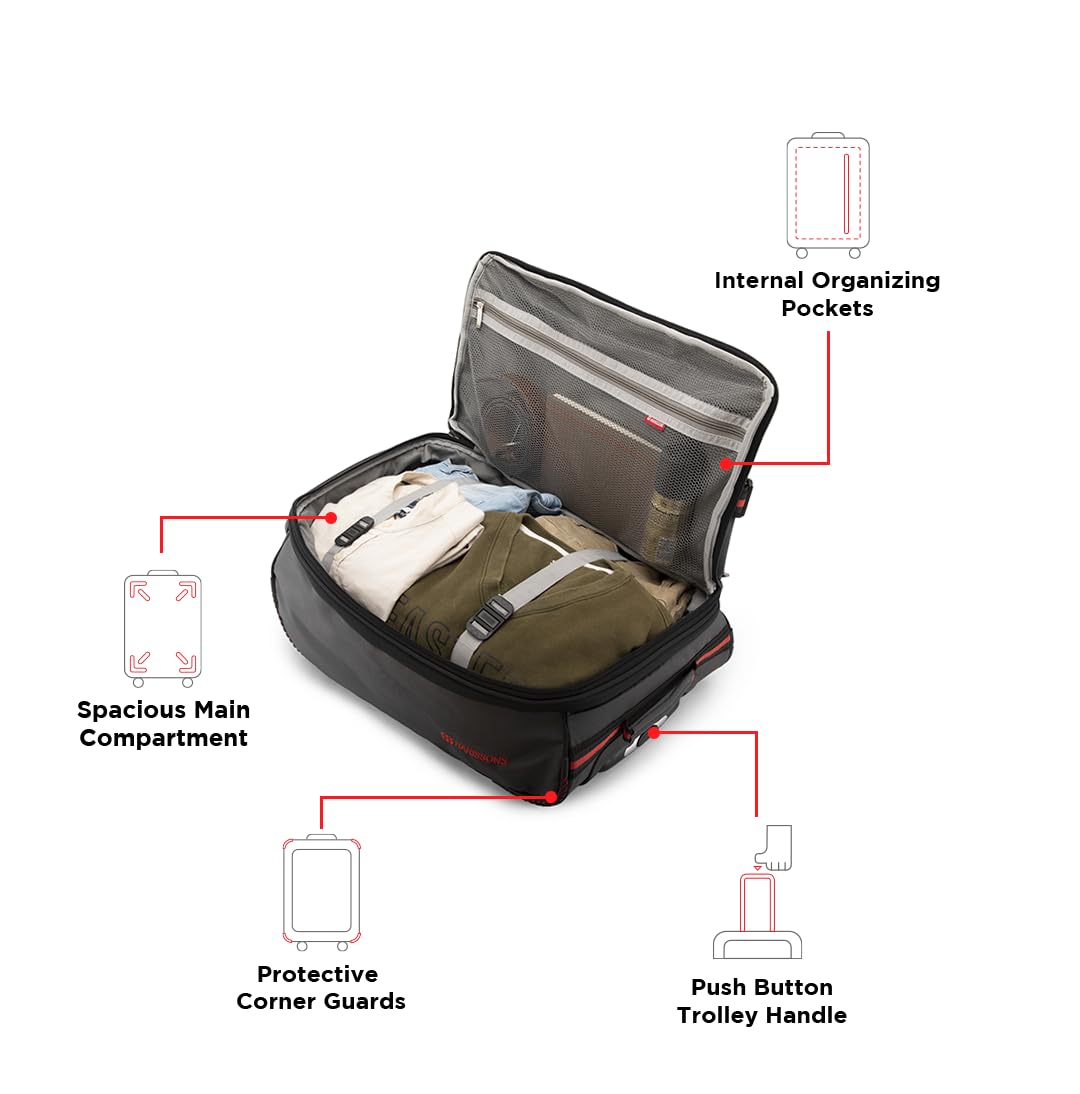 Sturdy & Glide-Ready Wheels: Effortless navigation with quick grab handle, glide ready wheels & push-button telescopic trolley handle. Ideal for hassle-free travel, efficient organization.