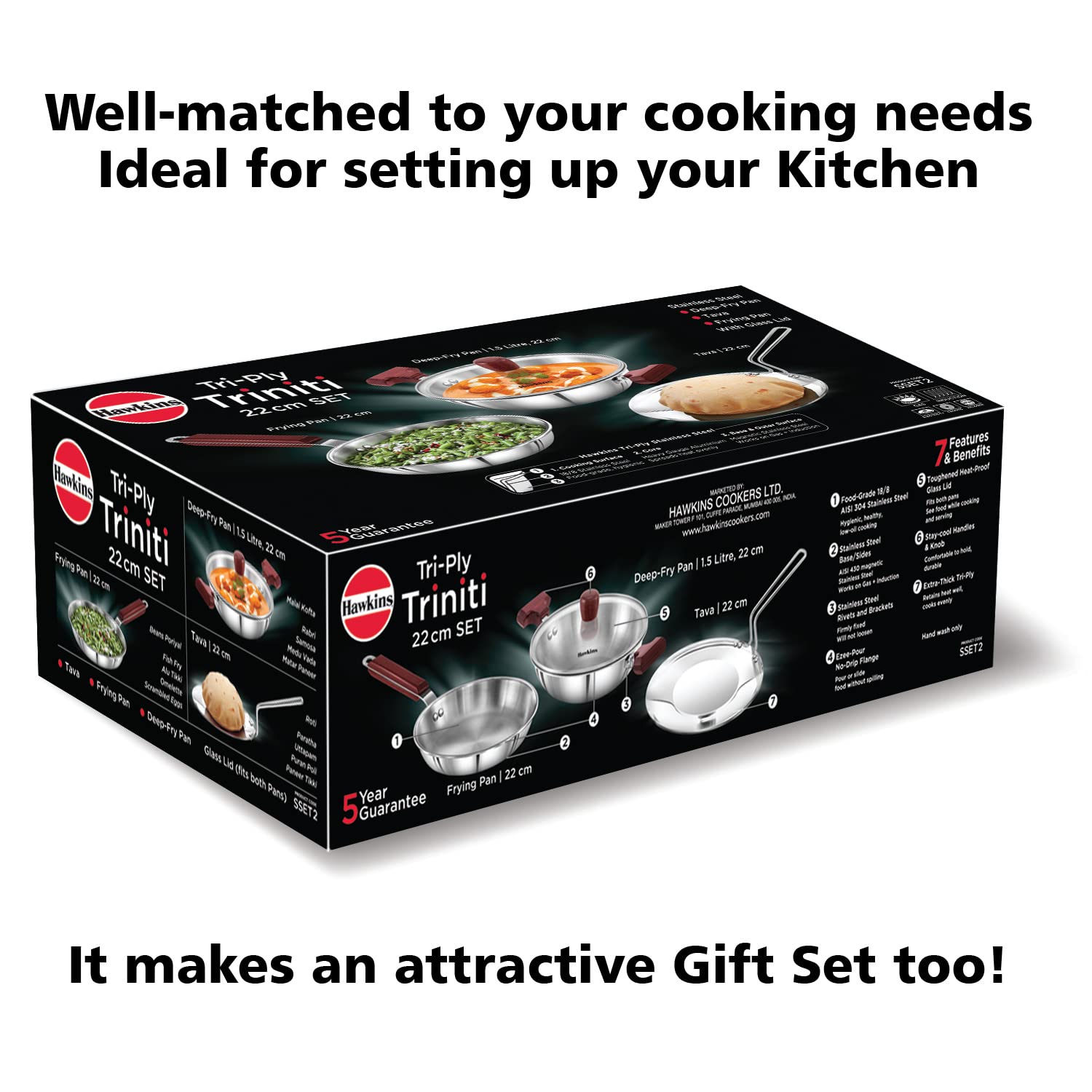 The Cookware Set is built from hand-picked Tri-Ply Stainless Steel induction compatible models that are carefully matched to cater to most of your cooking needs. It consists of TAVA (22 cm DIA; 3.5 mm THICK), FRYING PAN (22 cm DIA; 3 mm THICK) and DEEP-FRY PAN / KADHAI (1.5 LITRE; 3 mm THICK) with glass lid. Each item included in the Set is accompanied by its own Instruction Manual/Cookbook and its own Guarantee Card. Spatula and scrubber are also included. Each Set is securely packed in an attractive box – ideal for gifting. There are attractive savings on the purchase of the Set when compared with buying individual units separately.