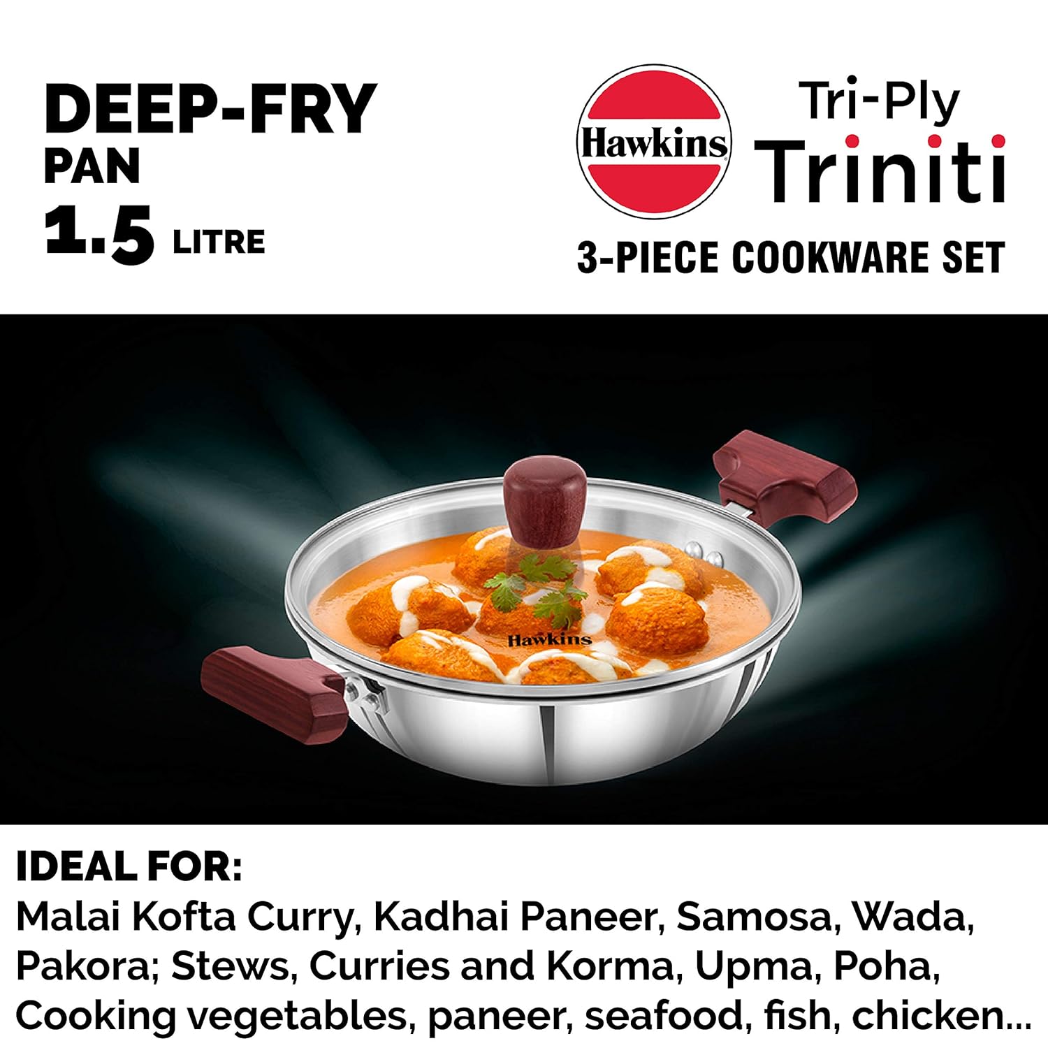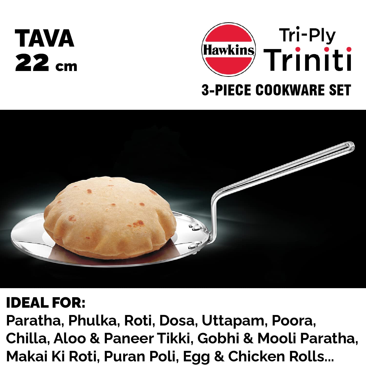 The cookware set consists a Tava, Frying Pan and Deep-Fry Pan with stainless steel lid to cater to most of your cooking needs