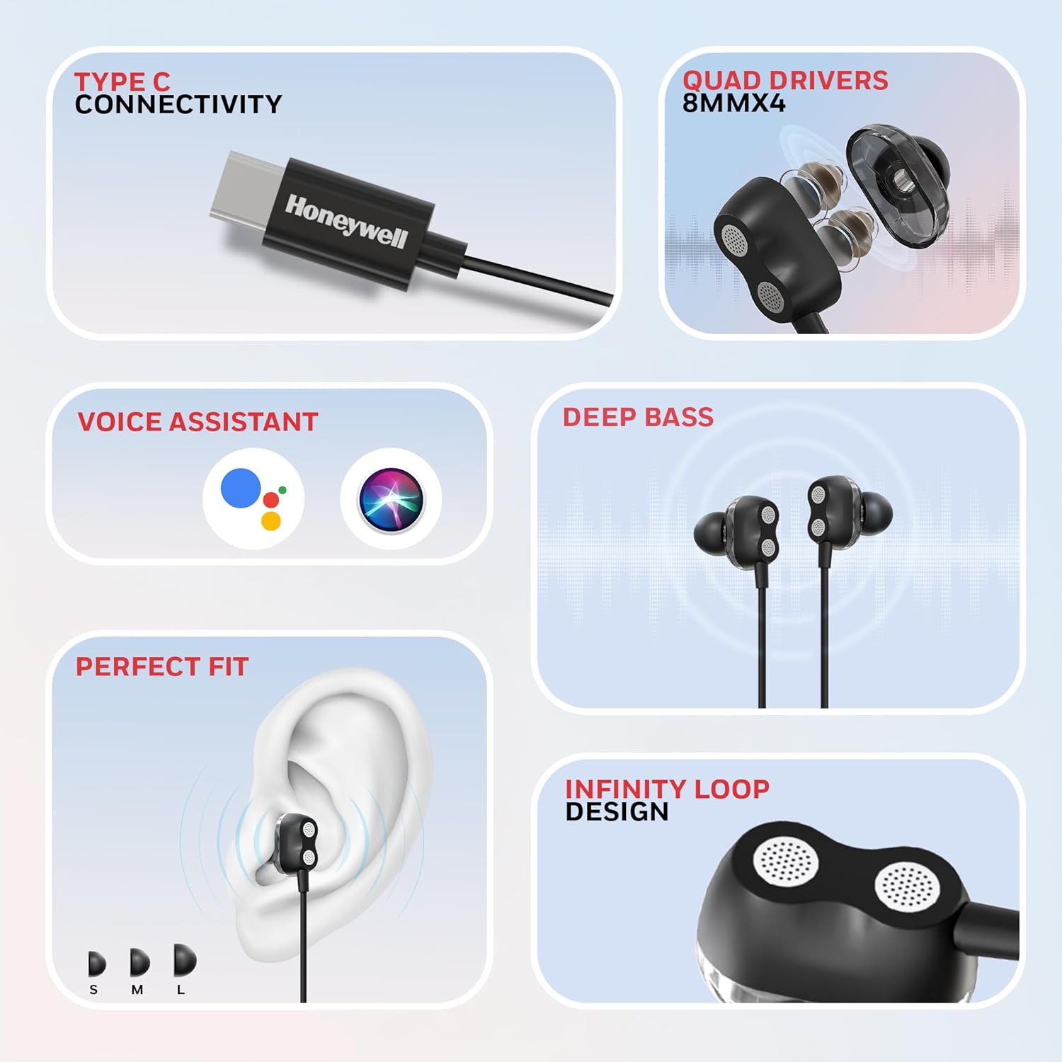 Honeywell Suono P80 Wired Gaming In Ear Earphones with Built-in Mic, 8mm*4 Drivers, IPX4, Noise Cancelling and ultra HD Mic, HD Sound & Clear Audio, Type C Compatible, Voice Assistant Enabled, 1.3 Mtr