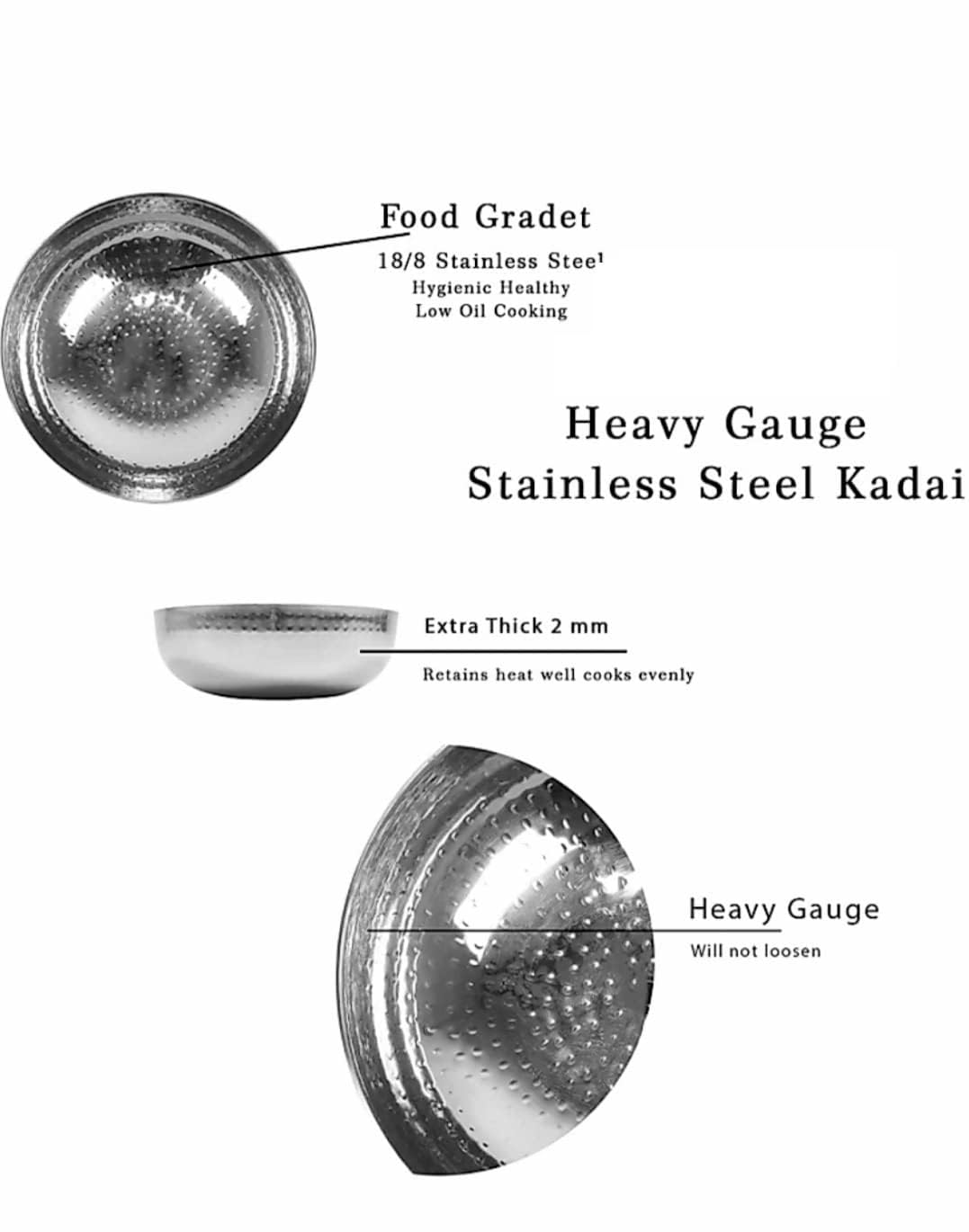 Package Content: 1 Heavy Gauge Hammered Stainless Without Handle Steel Kadai / Tasla, Material: Stainless Steel Product Dimension: 10 x 10 x 4 Inches in LBH format, Product Weight: 1200 gm
