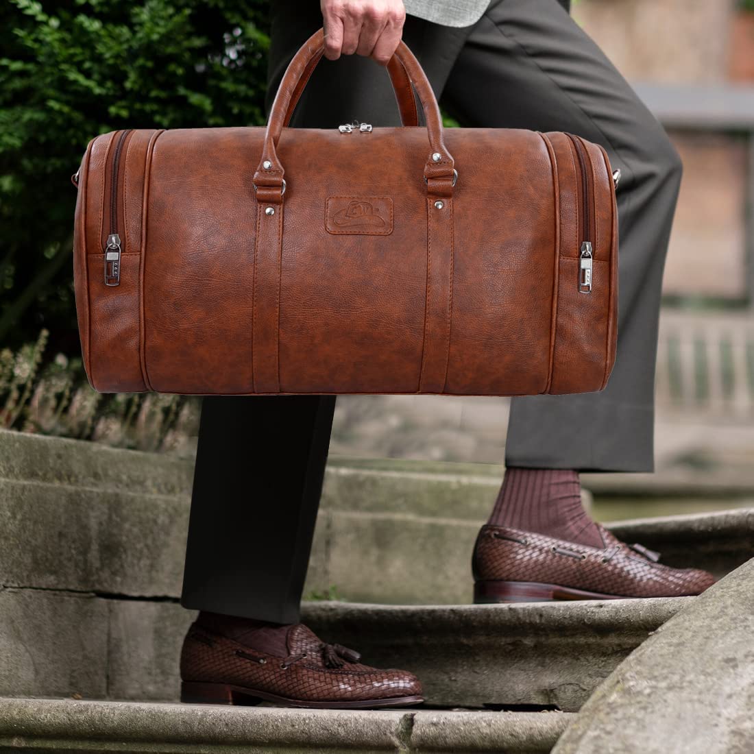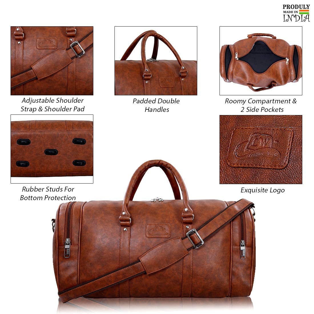 Leather Word Partner For Life Best Quality 100% Vegan leather and strong stitching make this bag a durable partner for you travels. A partner that ages well with you. It develops a unique relationship with you by developing patterns that are unique to your usage style. Our vintage design brings the essence of class to your style statement. Spacious zippered main compartment with plenty of room to hold any garments, personal or business essentials. The interior pocket is perfect for tickets, a boarding pass, or any small miscellaneous item. This bag can be used as a Gym Bag, Sports bag, Weekend getaway bag, Camping Bag, etc.