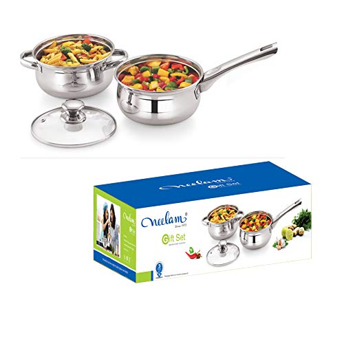 Steel Finish, Set of 3pcs Cookware Gift set Including Glass Lid, Contents Sauce Pan and Sauce pot used for Cook & Serve.