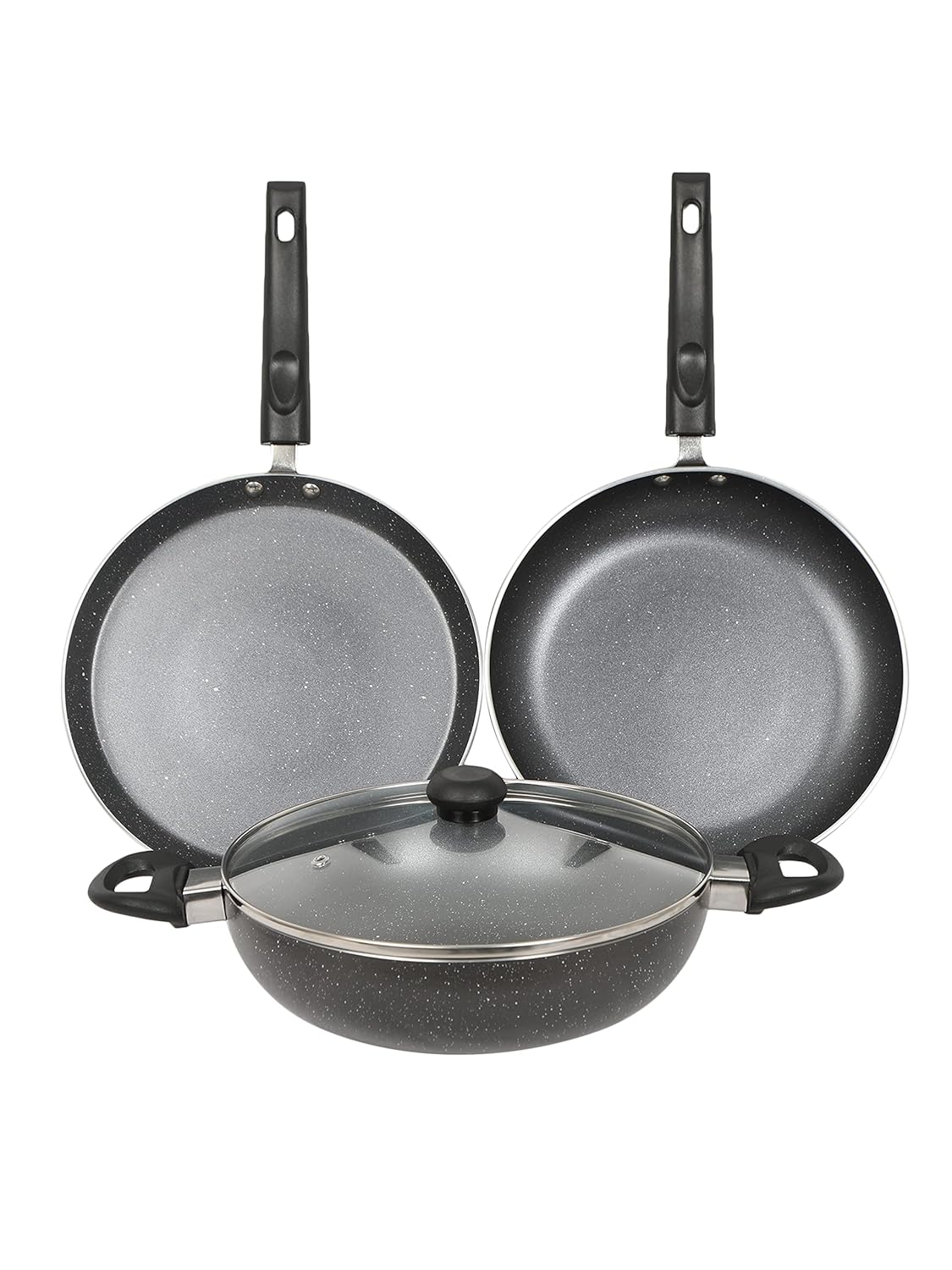 Color: Dark Grey, Material: Aluminum, Included components: 1 Non-Stick 24cm Kadai with Tempered Glass Lid, 24cm Fry Pan, 24cm Dosa Tawa.