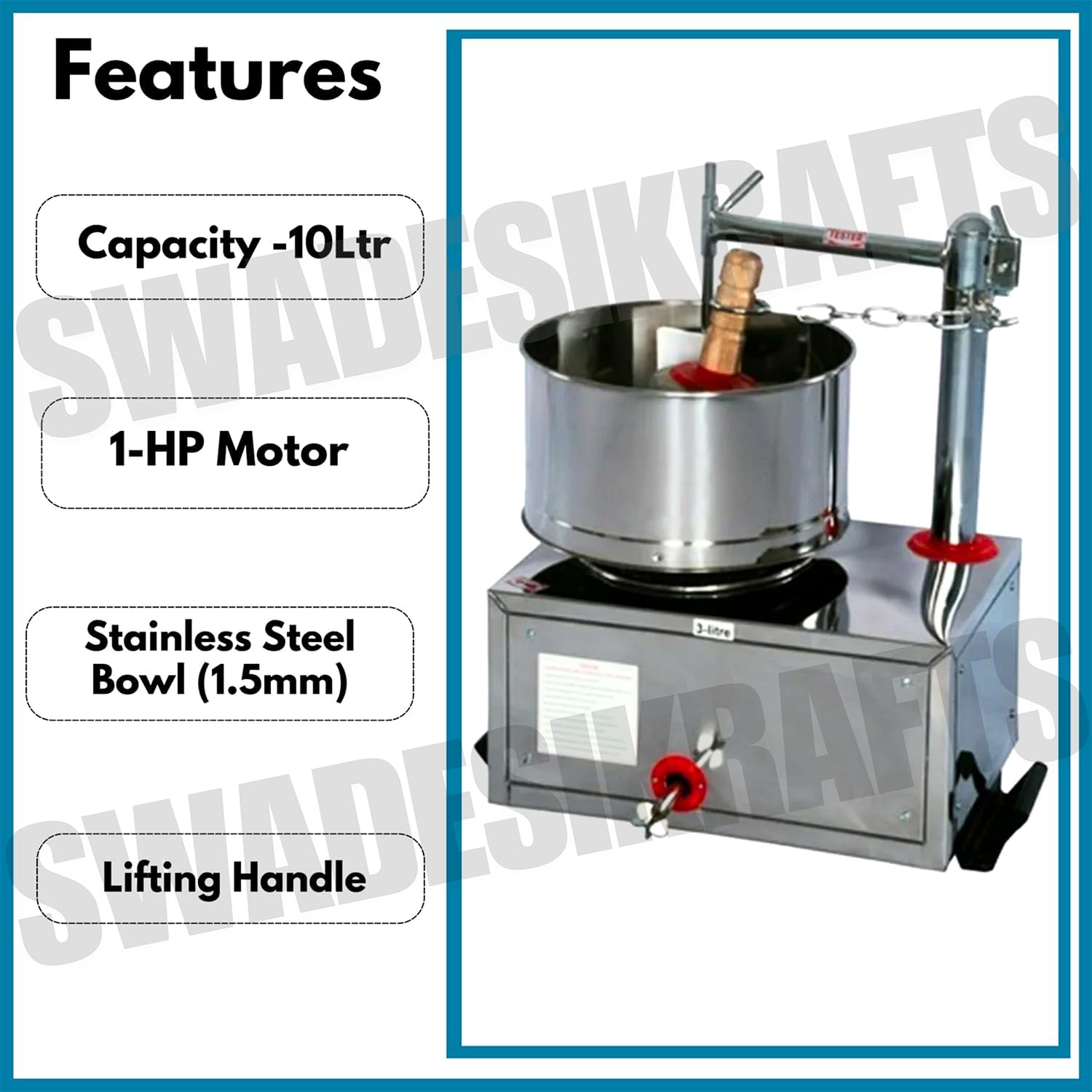 10ltr Stainless Steel Wet Grinder Machine with 1-Hp Motor for Kitchen | Hotel | Restaurant (Commercial Use Only) to Wet Dal, Rice, Dosa, Idle