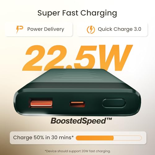 Specification: Ambrane 10000mAh Slim & Compact Powerbank, 22.5W Fast Charging, USB & Type C Output, Power Delivery, Quick Charge for iPhone, Android & Other Devices, Made in India + Type C Cable (Stylo 10, Green)