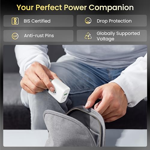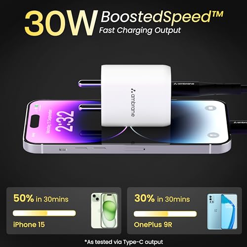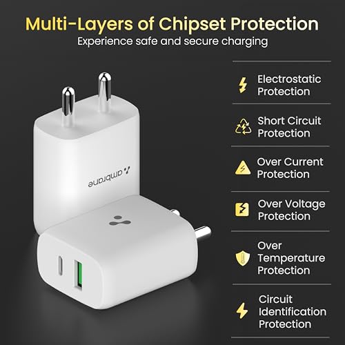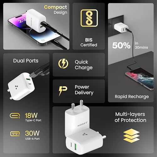 Specification: Ambrane 30W USB & Type C Fast Charger with QC & PD Technology, Fast Charging Compatible with iPhone, iPad, Samsung Galaxy, Note, Redmi, Mi, Oppo,Smartphones and More (RAAP H30, White)