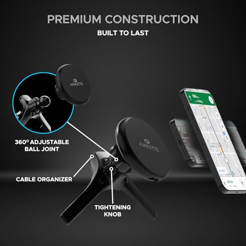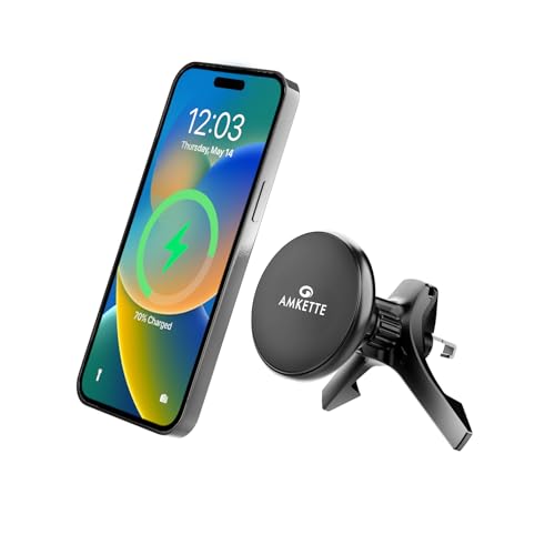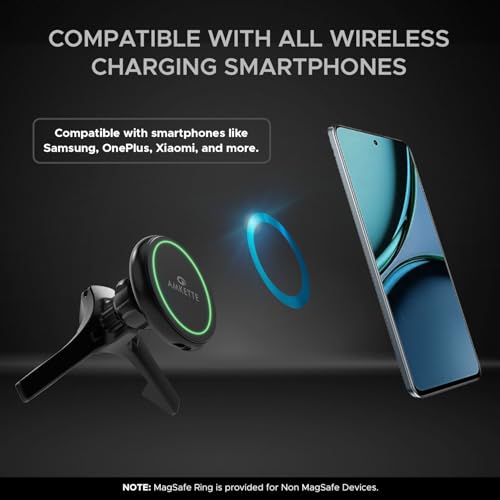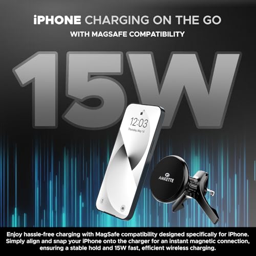 Specification: Amkette iGrip magnetic mobile holder for car with Ultra Stable Air Vent Hook&Super Strong Magnet|MagSafe Compatible 15W Charging for iPhone|MagSafe Ring Included for other Wireless Charging Smartphone