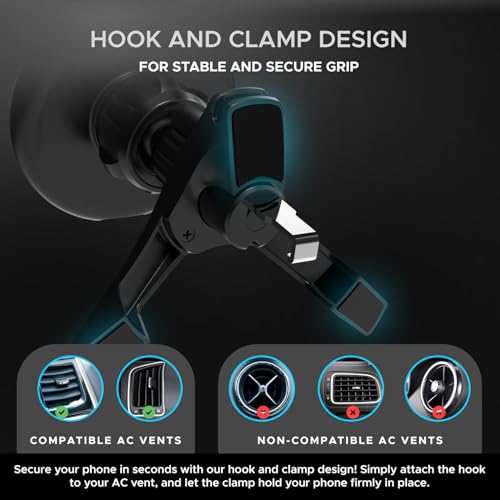 𝗦𝗲𝗰𝘂𝗿𝗲 𝗴𝗿𝗶𝗽: Powerful hook and clamp design provides a strong and immovable grip on the air vent, with a spread base for added stability on bumpy roads.