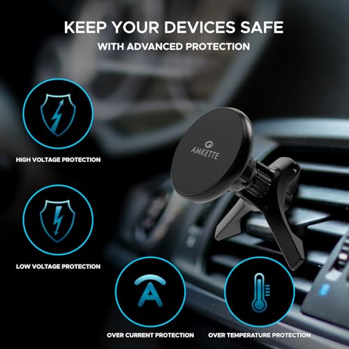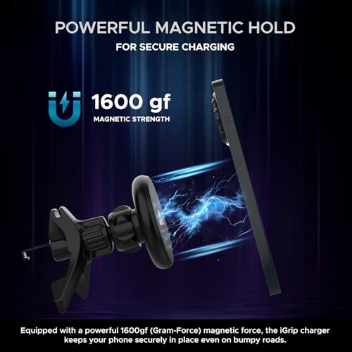 Amkette iGrip magnetic mobile holder for car with Ultra Stable Air Vent Hook&Super Strong Magnet|MagSafe Compatible 15W Charging for iPhone|MagSafe Ring Included for other Wireless Charging Smartphone