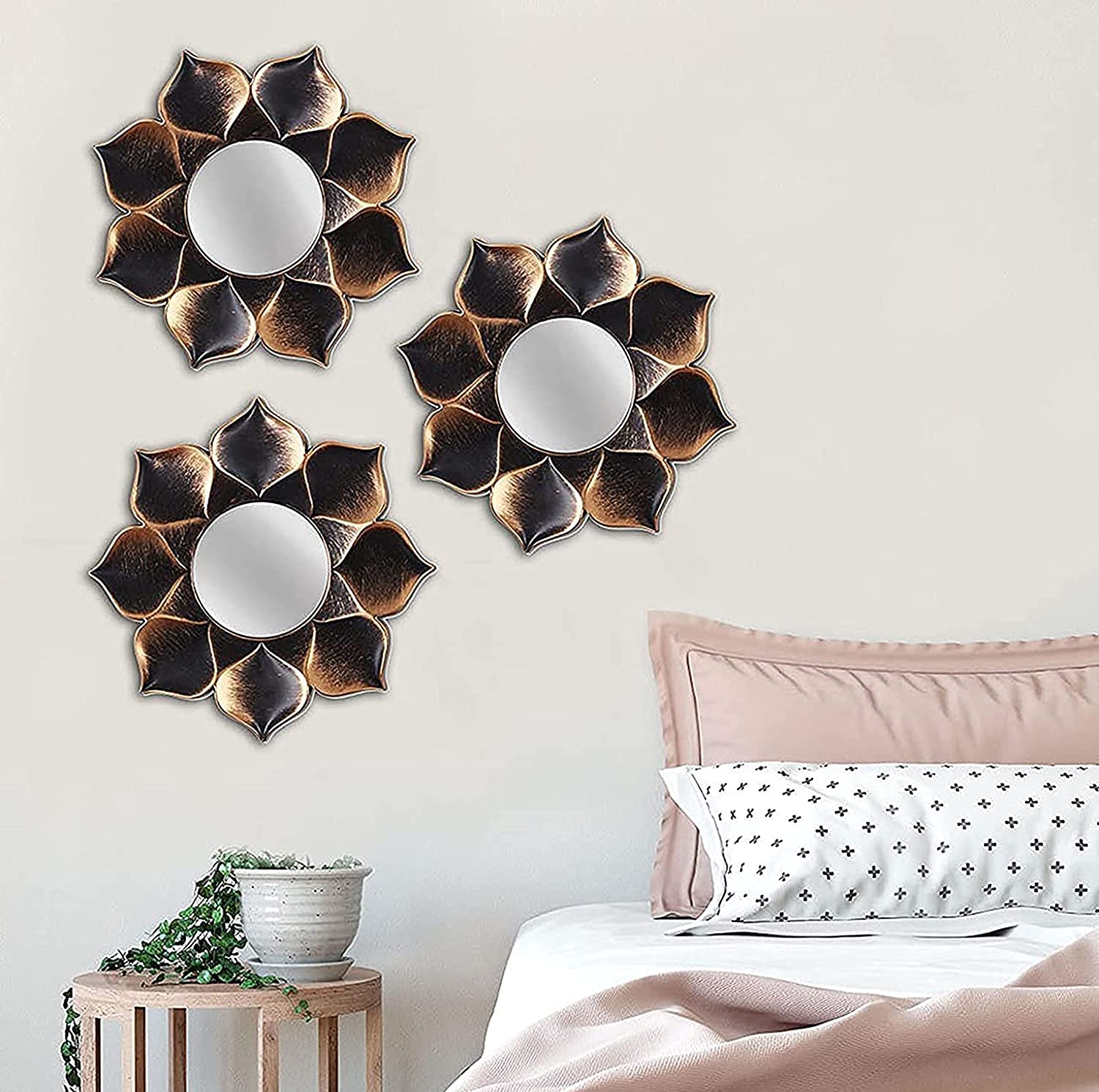 Art Street Plastic Lotus Petal Decorative Wall Mirror (Set of 3)(Size – 9 X 9 Inch, Framed, Black, Sunburst)