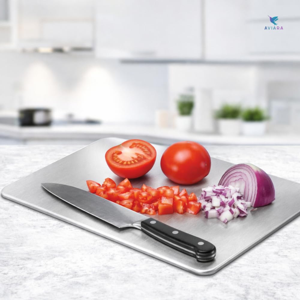 Welcome to AVIARA ENTERPRISE This AVIARA stainless steel chopping board brings professional-grade durability to your kitchen. Crafted from SS-304 food-grade stainless steel, this cutting board offers exceptional resistance to rust and odours, making it an ideal choice for both home kitchens and commercial restaurants. Measuring 36 cm × 25 cm with a 1mm thickness, it provides ample space for all your food preparation needs whilst remaining lightweight and easy to handle. The convenient carry handle allows for effortless transport from counter to sink or storage. Whether you’re chopping vegetables, cutting fruits, slicing meat and fish, preparing paneer, or slicing bread, this versatile board handles it all with ease. The non-porous stainless steel surface won’t absorb liquids or harbour unwanted smells, ensuring your ingredients maintain their fresh taste. Its sleek, brushed finish adds a modern touch to any kitchen whilst being incredibly easy to clean and maintain. Simply rinse or wipe down after use for quick cleanup. This durable cutting board is built to withstand daily use in demanding kitchen environments, making it a practical investment for anyone who values quality and hygiene in food preparation.