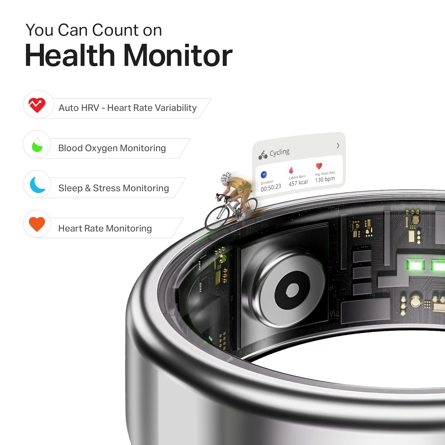 Auto Health Monitoring: Powered with next-gen precision sensors, SmartRing Active Plus automatically tracks fitness vitals like Heart Rate Variations (HRV), Heart Rate, SpO2, Stress, & Sleep—extremely intuitively. It is known for accurate health monitoring, so you stay aware of your vitals, always.