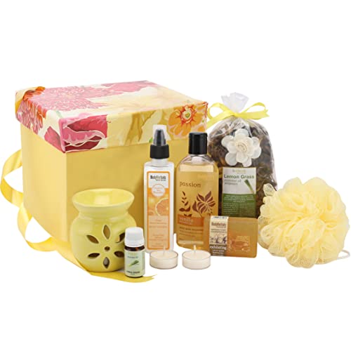 KIT INCLUDES: Vanilla Shower gel 200ml {1 Pc}, Orange Natural Moisturising Body Lotion 200 ml{1 Pc}, Lemon Grass oil 10 ml {1 Pc}, Bath Puff {1 Pc}, 2 Tea Lights, Lemon Grass Bathing Bar 100gm {1 Pc}, Lemon Grass Potpourri, Diffuser {1 Pc}