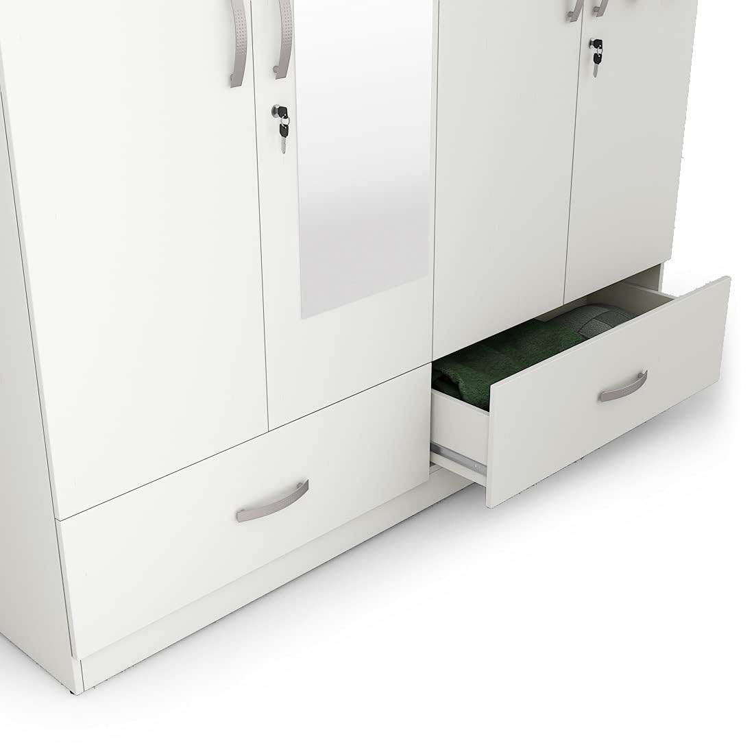Material:- The material is particle board with melamine finish. This Product is made with environment friendly Particle board suitable for indoor furniture usage. Panels are laminated with scratch resistant melamine finish & edge banded on all exposed surfaces to protect from moisture. This product is termite resistant & borer proof. Construction:- The wardrobe has hinged doors . Wardrobe doors are fitted with mirrors. Storage:- The oval shape allows the hangers to twist on the pole easily . Oval poles are also stronger due to their weight bearing capacity. The hanger pole is installed at an ergonomic height for easy accessibility of hangers. External lower drawers provided at the bottom to keep shoes. The foot drawer is mounted on telescopic channels. These channels provide full accessibility to the storage space. All doors are fitted with locks that come with metal keys.