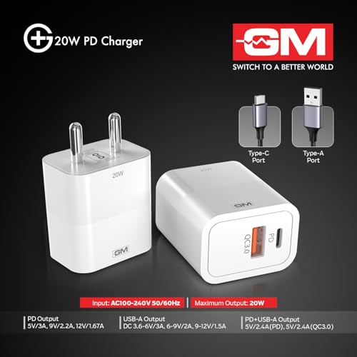 Specification: GM G+ 20W Dual-port Charger – Compact Design with High Power Delivery, Combined output of Dual port 24W | 2-in-1 PD QC 3.0 Charger, Type C and USB A Adaptor for iPhones and Android Phones