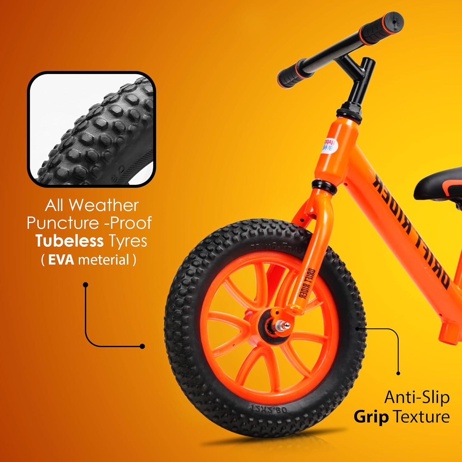 The Perfect Balance Bike for 3-5 Year Old Kids. The First Bike for every child & the best scientific way to teach them the art of Balancing. Comes Factory Assembled. No need for complicated and time consuming assembling unlike other balance bikes. Just adjust the seat & handle and it’s ready to use. Puncture Proof Wheels with Ultra Grip ride quality. Provides excellent support even on demanding surface. Light Weight Carbon Steel Frame weighs just 2.7 Kgs. SGS & EN71 Certified