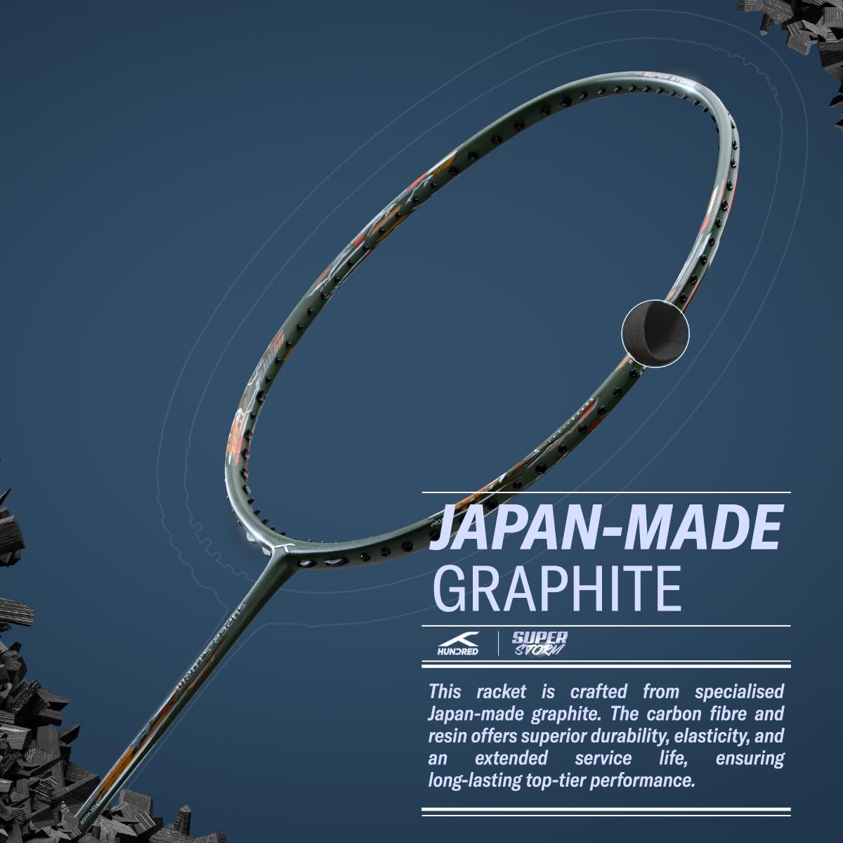 Japan-Made Graphite : This racket is crafted from specialised Japan-made graphite. The carbon fibre and resin offers superior durability, elasticity, and an extended service life, ensuring long-lasting top-tier performance.