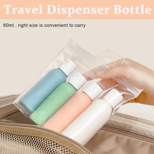 GREAT PORTABILITY: 60ml travel organizer bottles, convenient to carry. The travel toiletries kit can be put in any makeup bag or toiletries bag. Great choice for short trip. The travel bottle toiletry container suitable for various toiletries, including facial cream, shower gel, shampoo, cream, sanitizer, etc.
