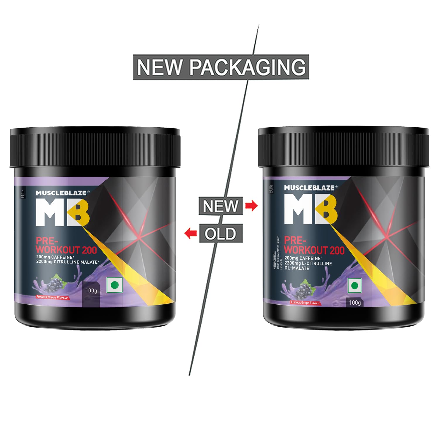MuscleBlaze Pre Workout 200(Furious Grape,20 Servings,100 G)| 200 Mg Caffeine,2200 Mg Citrulline Powder,1 Count
