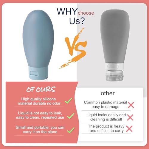 Premium Material】The travel toiletry bottles are made of food-grade silicone and PE, soft, squeezable, refillable and reusable. They are flexible and stretchy so you can squeeze them out with a single pinch and won’t deform after repeated squeezing. Perfect for assembling your toiletries while you travel!
