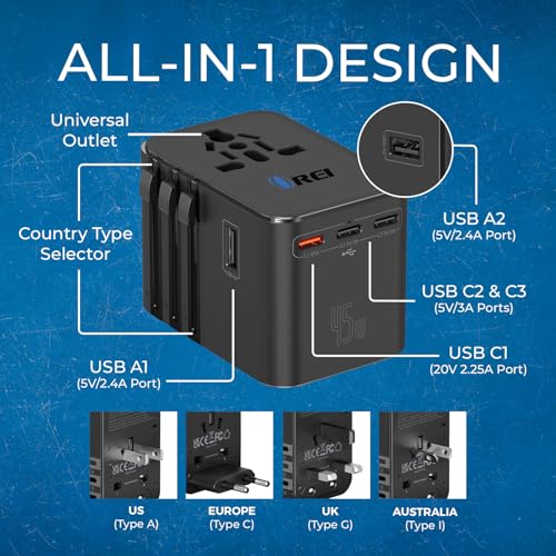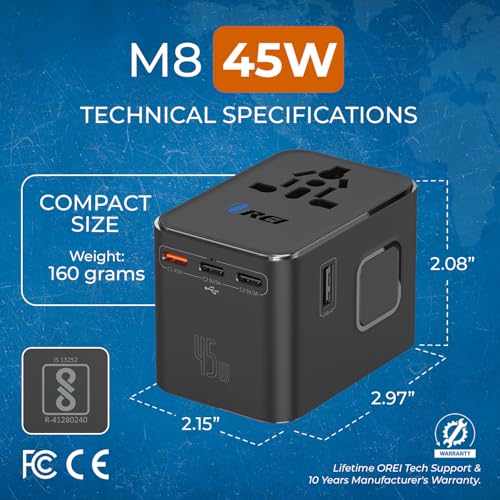 Specification: OREI 45Watt Universal Charger Adapter | 3X USBC 2XUSB A – 6-in-1 International Travel Adapter | 10 Years Warranty | Universal Travel Adapter Compatible 150+ Countries | Type C, A, G, I Compatible