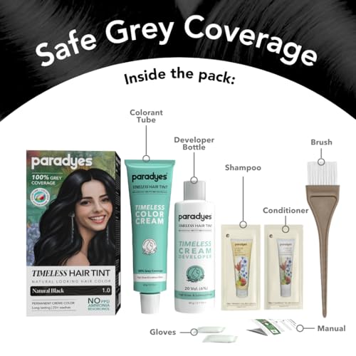 Specification: Paradyes Natural Black Timeless Hair Tint, Permanent Crème Hair Colour for Natural-Looking Results, Complete Grey Coverage, Long-Lasting Formula Free from PPD, Ammonia, & Resorcinol, 1.0 Natural Black