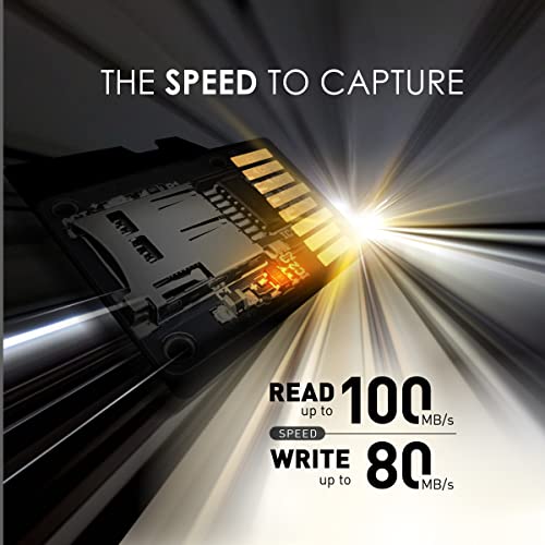 C10, U3, V30 speed class performance with read speeds up to 100MB/s and write speeds up to 80MB/s for fast and smooth HD photography and 4K Ultra HD videography.