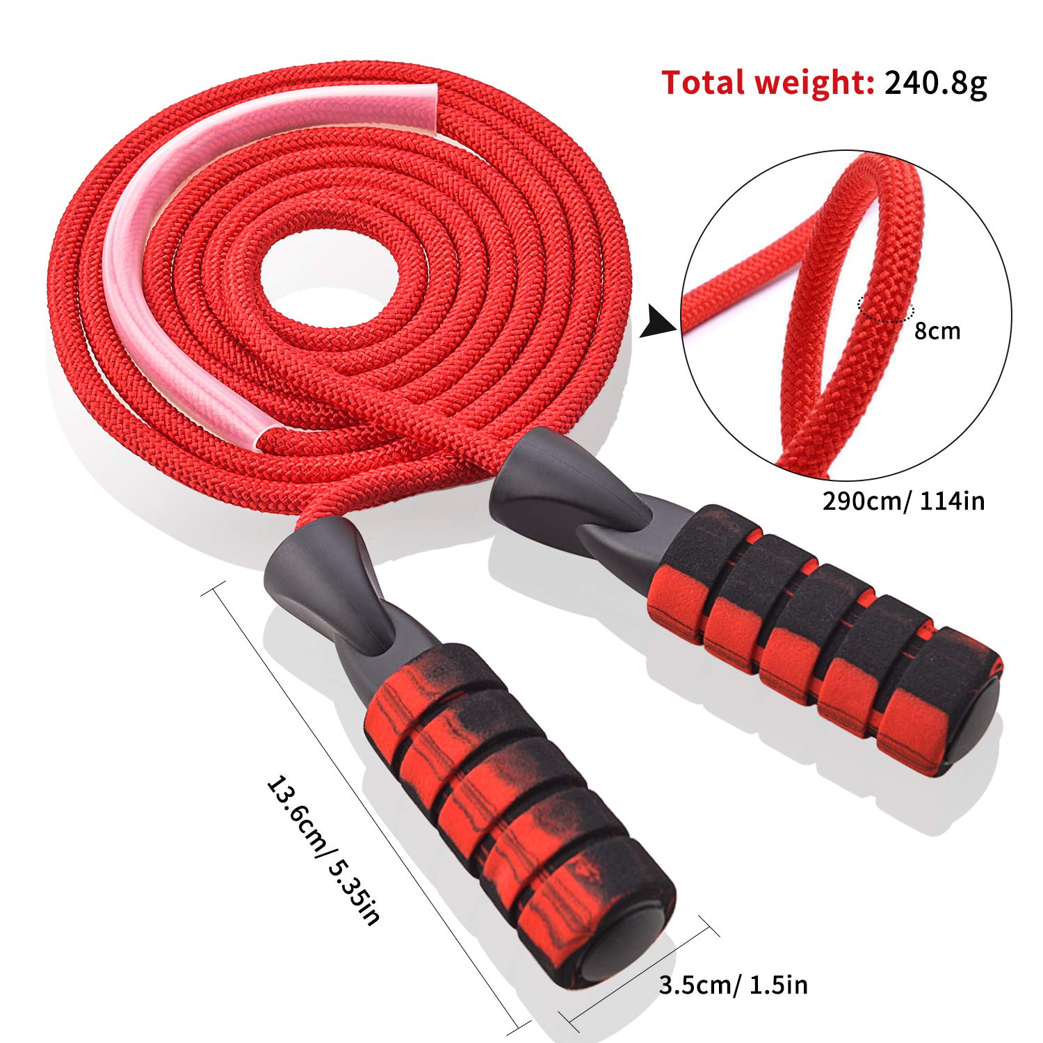 Soft Cotton Rope – Our jump rope is made of high quality polyester cotton and covered with silicon protective case to ensure maximum service life. The rope is 9.84 feet long and 0.31 inches(8mm) in diameter, 0.5 lbs weight.
