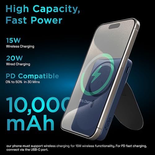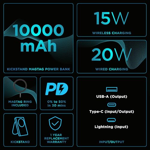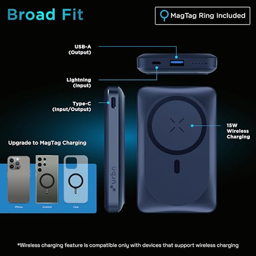 Specification: URBN 10000mAh Sleek MagSafe Power Bank with Kickstand | 15W Fast Wireless & 20W Wired Charging | Strong Magnetic Hold | Dual Input (Type-C & Lightning) | Triple Output | Pass-Through Charging (Blue)