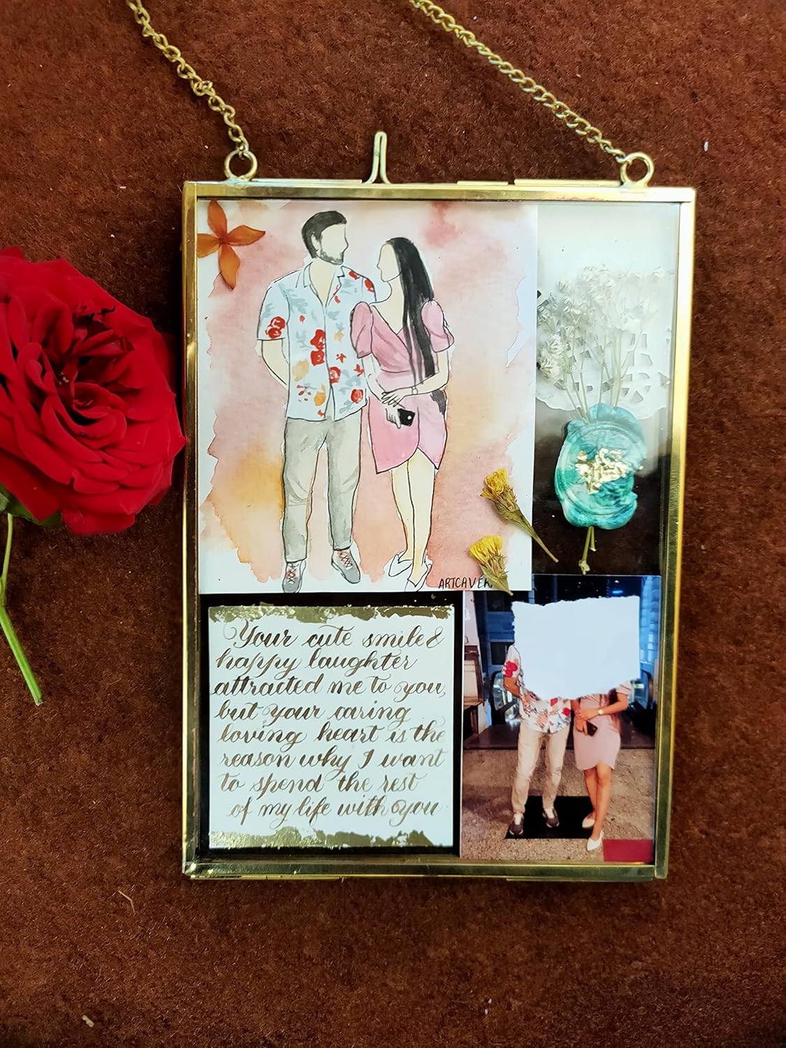 PERFECT FRAME FOR CUSTOMIZED GIFTS: The glass and metal brass hanging frame has an ideal size (5×7 inch) and it comes with a brass border, brass lock on top which makes the frame open from top to down, and a beautiful brass chain. Because of transparent glass, anything you put in the frame for photo or pressed dried flowers will stand out and make your wall decor look beautiful. It comes in a thermocol casing and in a sturdy 3 ply cardboard box.