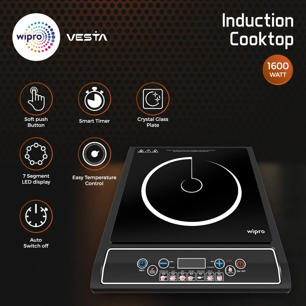 Wipro 1600 Watt Induction Cooktop With Touch Control (Black) With Crystal Glass Plate, (Vc061160), Sealed, 1 Burner