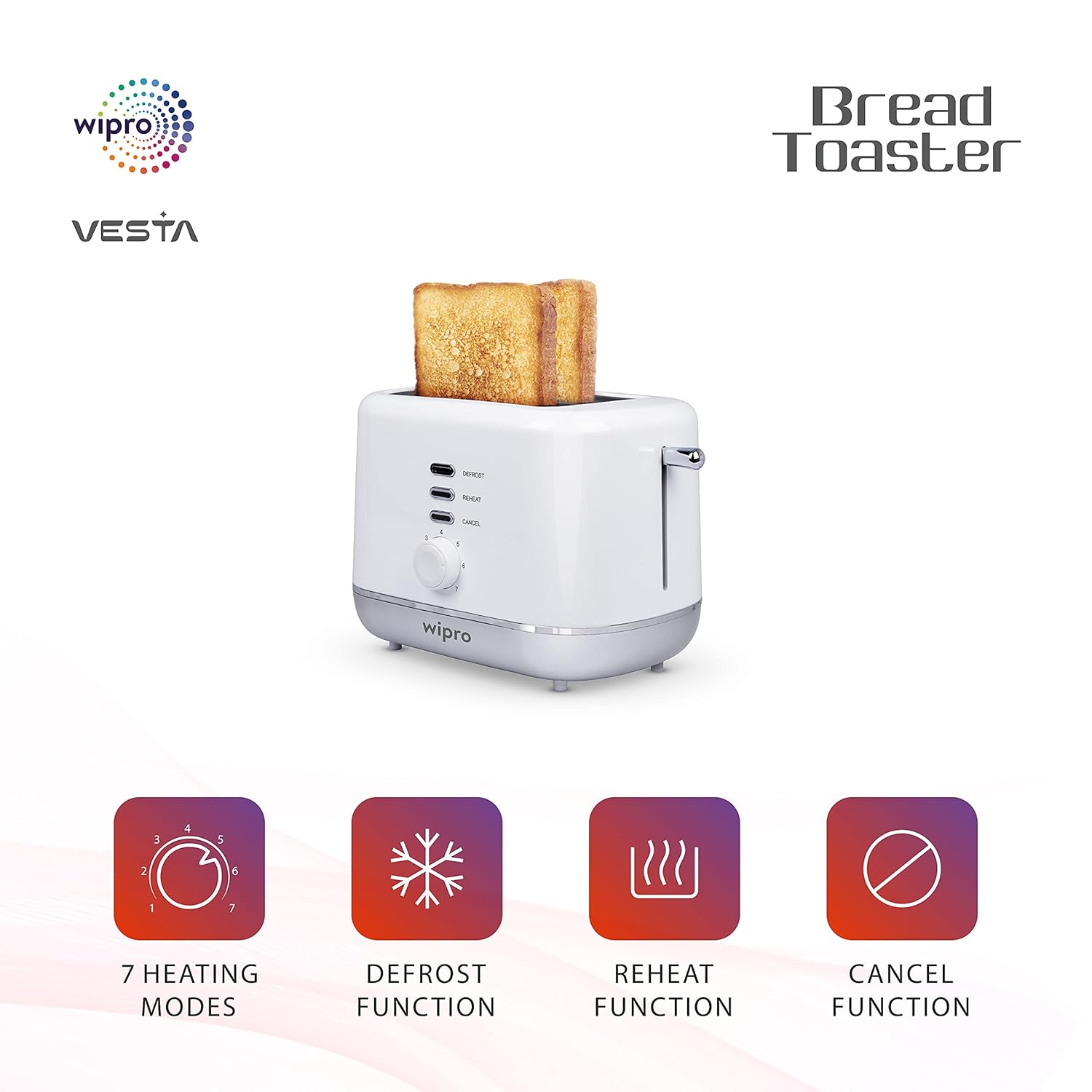 Wipro Vesta Bread Toaster 800 Watts Auto Pop up with Removable Crumb Tray, 7 Browning Levels with Defrost and Pre Heat Function (White), Standard (VA021020)