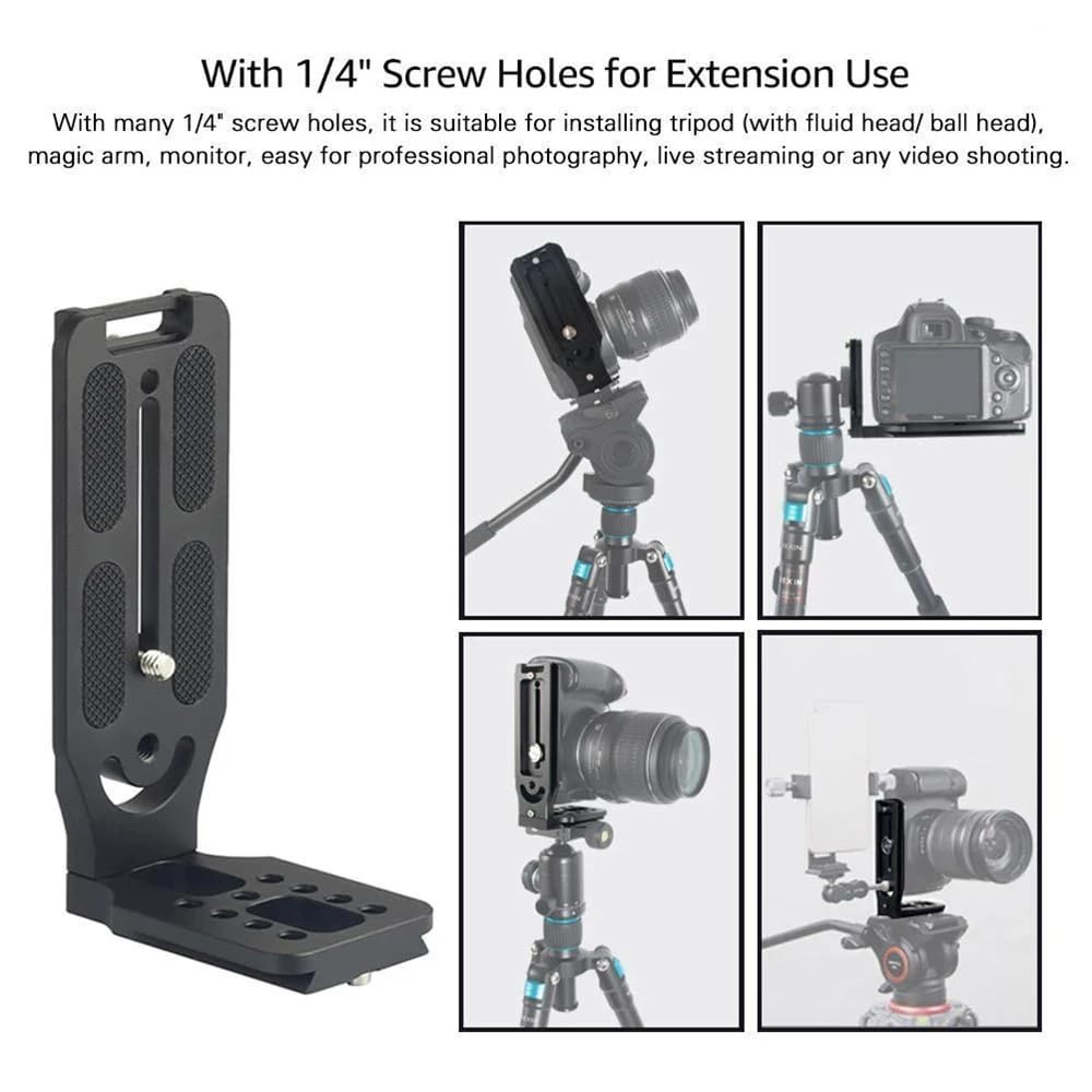 Quick Release Design: Switch between vertical and horizontal shooting effortlessly with the quick-release mechanism, allowing for smooth and rapid adjustments on the go.Universal Compatibility: Works seamlessly with Canon, Nikon, Sony cameras, and popular stabilizers like DJI Osmo Ronin and Zhiyun. Also compatible with most tripods and monopods.Durable Build: Crafted from aluminum alloy, this L-plate is lightweight yet strong, providing stability and durability even during intense shooting sessions.Dual Camera Bracket: Easily mount two cameras or a camera and accessory simultaneously for multi-angle shooting, making it ideal for professional video creators.Stabilization Ready: Perfect for use with SLR stabilizers, ensuring steady shots in both vertical and horizontal orientations.Anti-Slip Grip: Features a secure anti-slip design to keep your gear firmly in place, even during dynamic movements.