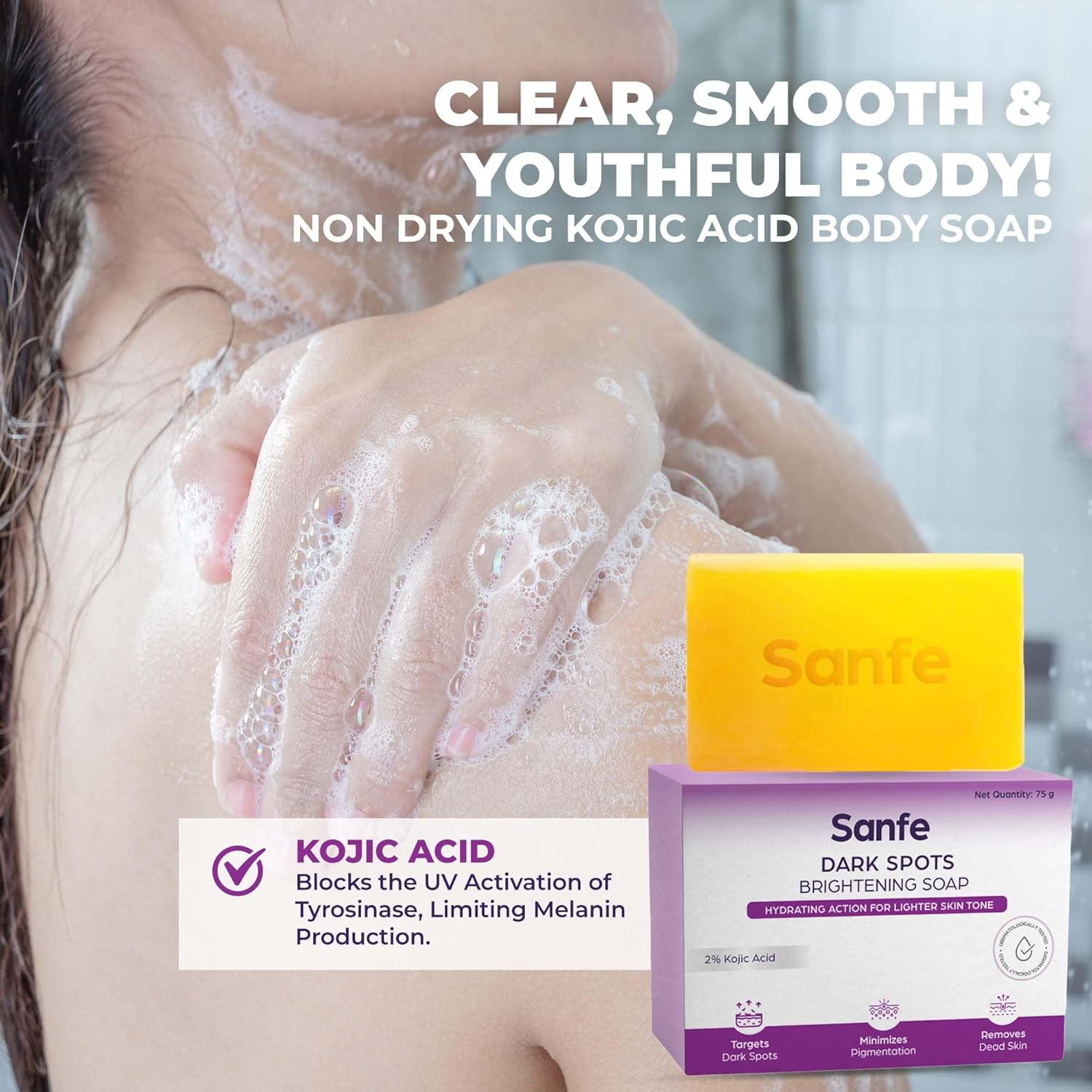 SAFE FOR YOU AND YOUR SKIN: Sanfe Dark Spots Brightening Soap is dermatologically tested, making it safe for all skin types. It is paraben-free, cruelty-free, and free from harmful chemicals.