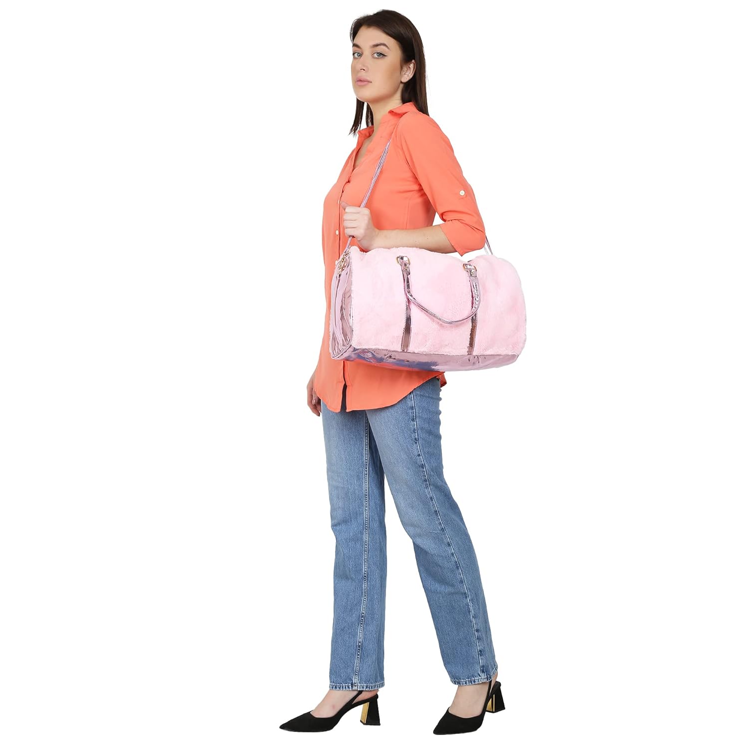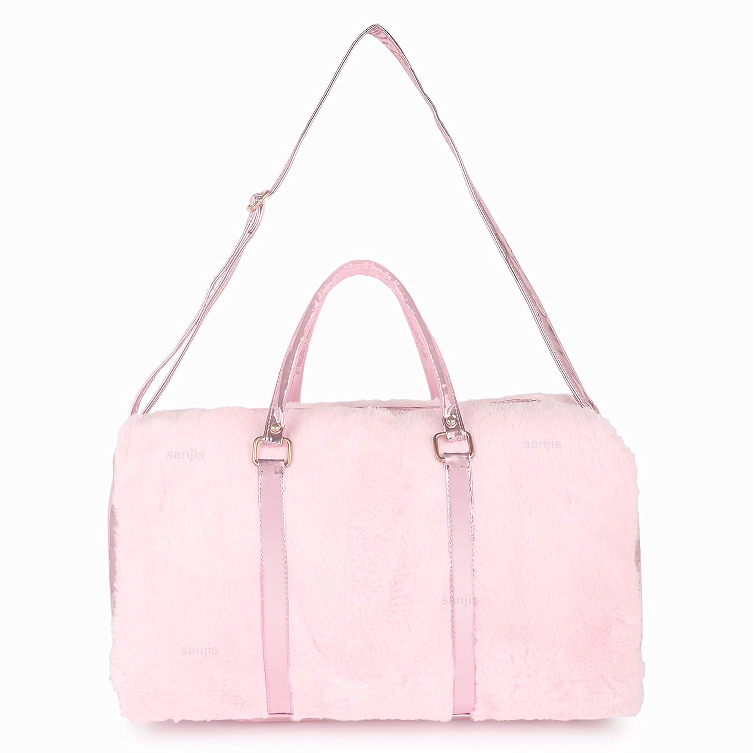 Super sturdy structure of this fancy pink fur duffel bag won’t lose shape when full loaded, but also soft enough to fold up into luggage. Also perfect to carry it on a flight and sit this fancy pink duffel bag under the seat