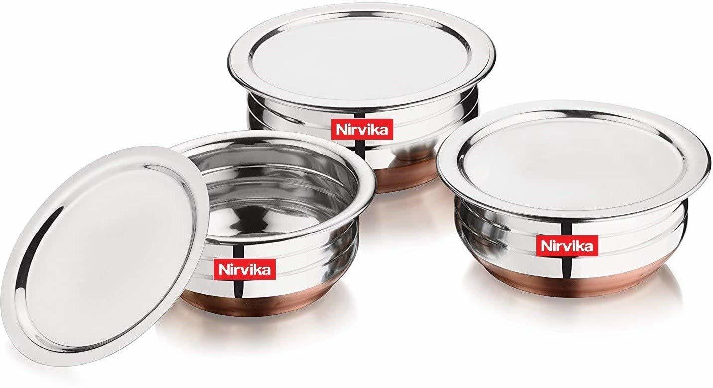 The Handi is made of good quality materials which sure to add to its durability. It is highly stable and can stand strong. Perfect Copper Handi Set for Everyday Use Whether you want to cook a delicious serving of your favourite sabzi or heat leftover curries from the previous day, the 5-piece copper handi set from Nirvika is the ideal solution for a wide variety of cooking requirements. Available in a set of Five handis featuring capacities of 2.000 L, 1.500 L, 1.000 L respectively, you can use this cookware set can be used for a multitude of purposes with equal ease. Stunning Design with Durable Body With a mirror polish steel finish and an extremely sturdy body, the Nirvika copper handi set adds to the overall decor of your kitchen space. Featuring a stainless steel body and a thick gauge copper base at the bottom, this handi set is the perfect combination of style and substance. The unique design of these handis ensures even distribution of heat, thus avoiding burning of food and providing a more fuel-efficient solution for your cooking needs. Along with being perfect utensils for cooking food, it can also be used to serve your meals in a stylish manner. Easy to Clean and Maintain Thanks to the durable material used in the 5-piece copper handi set from Nirvika, washing and maintaining it is a relatively easy task. Simply use a mild soap detergent and keep it looking new for a long time even with regular use. This Handi set is ideal for Cooking Serving Pot Biryani Handi a wide range of Indian, Traditional and Western dishes. These are easy to clean, tough and long lasting. capacities of 1000ML, 1500ML, 2000ML. Similar Brands on Amazon