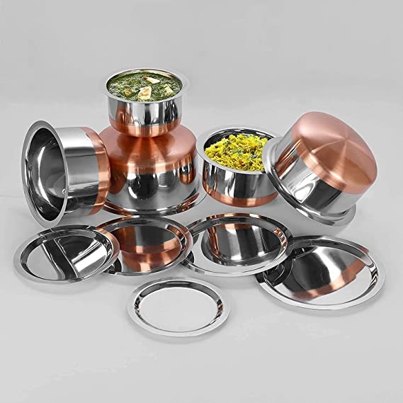 **Easy To use Patiia and lid set of 5** : Ideal For Daily Use On Your Gas Stove. Energy Efficient. Heats Evenly And Cooks Faster. Food Will Not Stick To Your Pan. **Attractive Design** : These Handi Are Is Only Attractive To Look But Also Has A Very Large Capacity. They Can Be Used Not Only To Cook Food, But At The Same Time Due To Their High Storage Space And Attractive Looks, You Can Use Them As Cookware As Well As Serve ware On Your Table Top. **Premium matereal** : Copper Bottom. Premium Quality Mirror Finish Stainless Steel Deep Handi / Cooking Pot For Kitchen. Export Quality Stainless Steel Making The Utensil Highly Durable, Long Lasting & Rust Free. Giving It A Long Live, Keeping It Beautiful For Years /Generations.