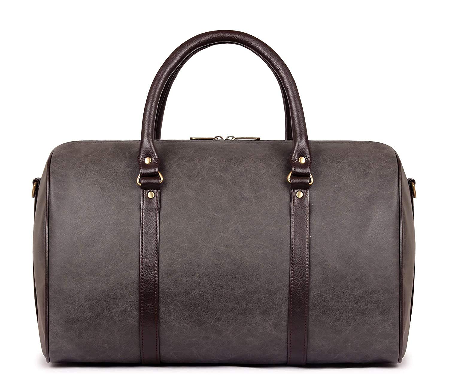 This stylish duffel bag is made of high quality water resistant Vegan Leather material with rich ash grey finish. For the inner lining we use soft feel premium quality polyester fabric.The metal fittings small size used are sturdy and durable. The embossed logo gives it an elegant look.